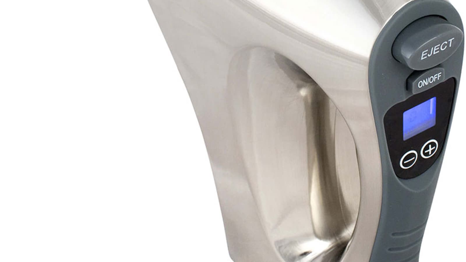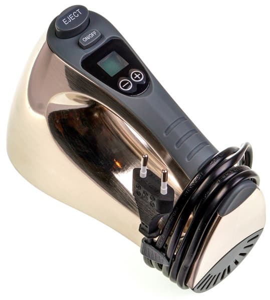 Миксер сразу притягивает взгляд своими плавными закругленными линиями и стальным корпусом. На эргономичной прорезиненной ручке находится ЖК-дисплей, что достаточно необычно для ручного миксера. Шнур обматывается вокруг корпуса и закрепляется пластиковой клипсой.