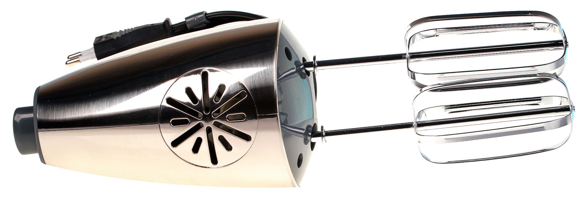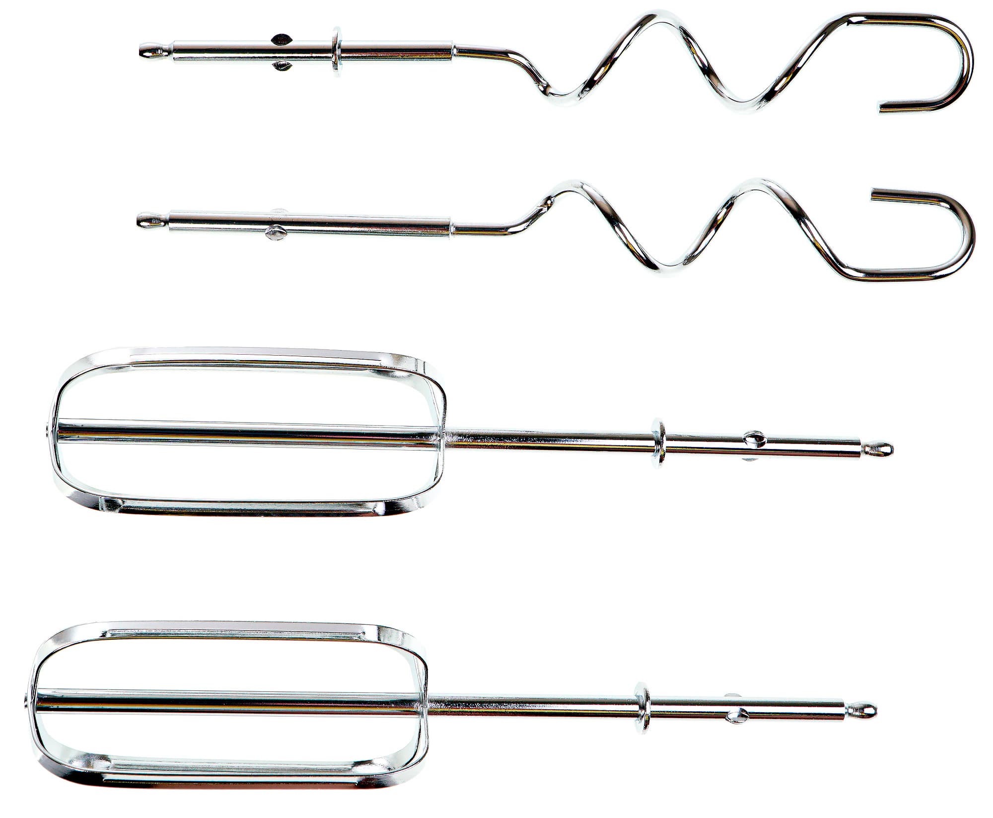 В комплекте с прибором идет две пары насадок: венчики для взбивания и крюки для замеса теста. Насадки сделаны из нержавеющей стали.