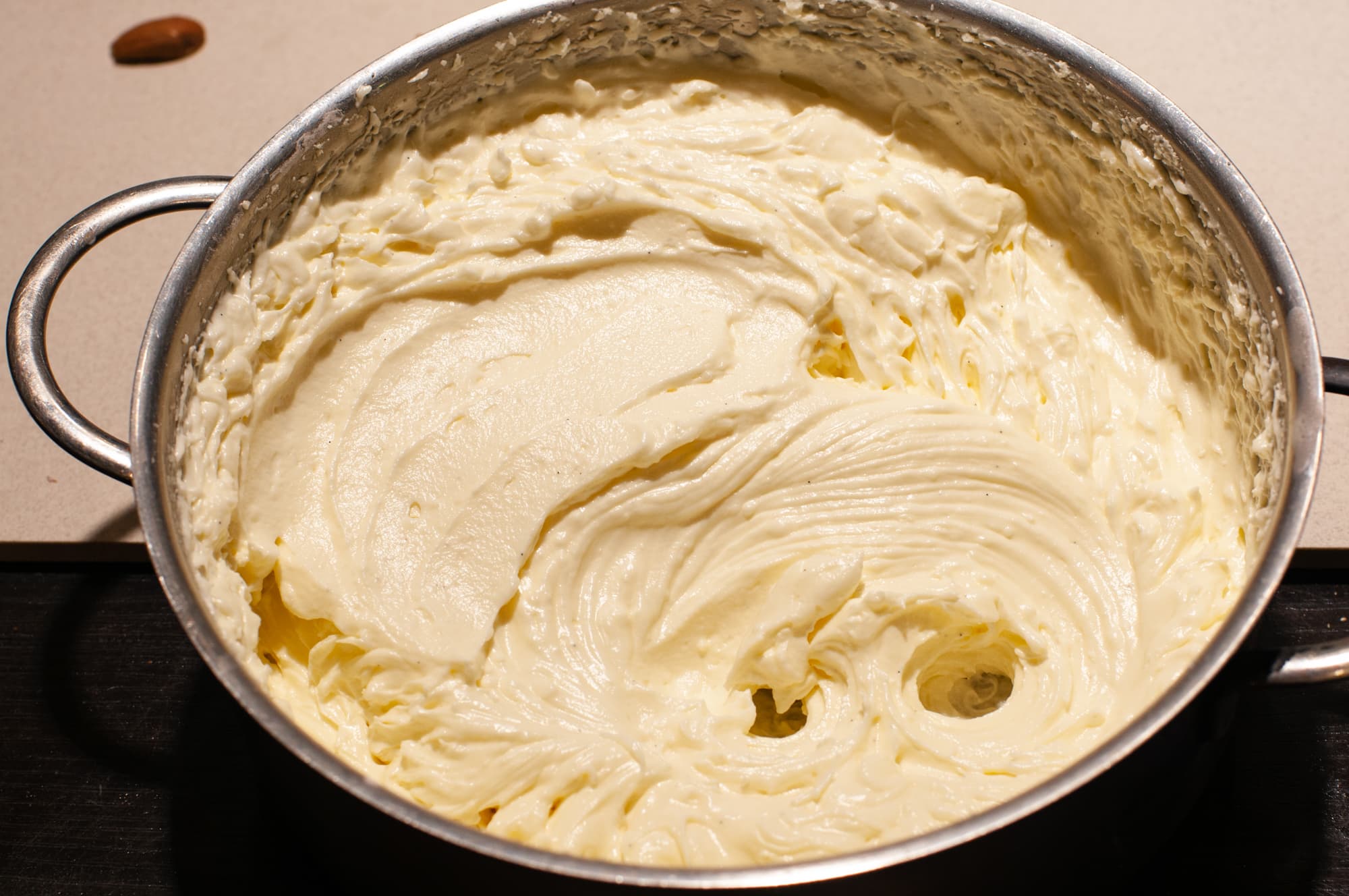 Для крема нам понадобились молоко, сливки, кукурузный крахмал, сахар, ваниль и сливочное масло. В холодном молоке со сливками растворили крахмал и сахар, положили стручок ванили и поставили на огонь до загустения. Остудили, добавили сливочное масло комнатной температуры и тщательно взбили миксером на средней скорости до получения гладкой текстуры без комочков.