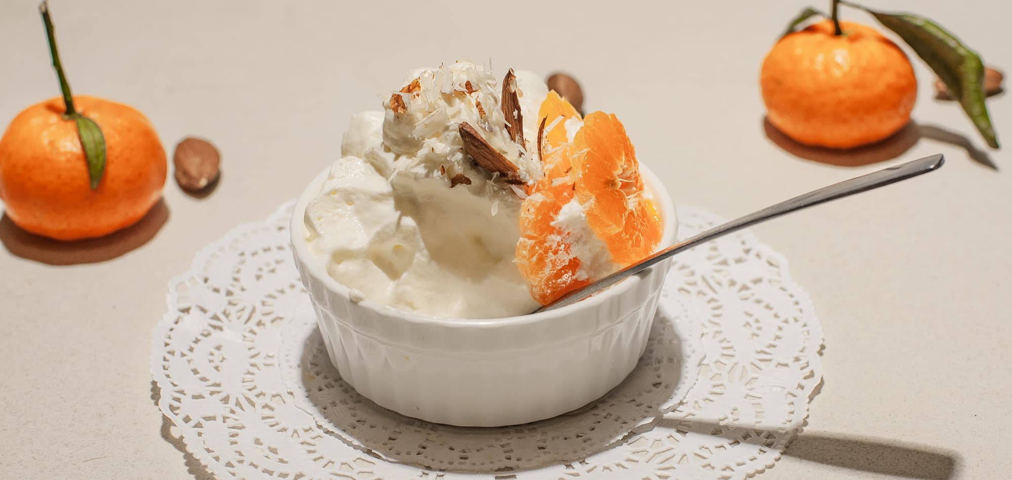 500 мл сливок «Клевер 35%» охладили, перелили в удобную емкость и взбивали венчиками на высокой скорости в течении 12 минут. Когда сливки образовали устойчивую плотную пену, выложили их в креманки, посыпали сахарной пудрой, добавили мандарины и миндальную стружку.