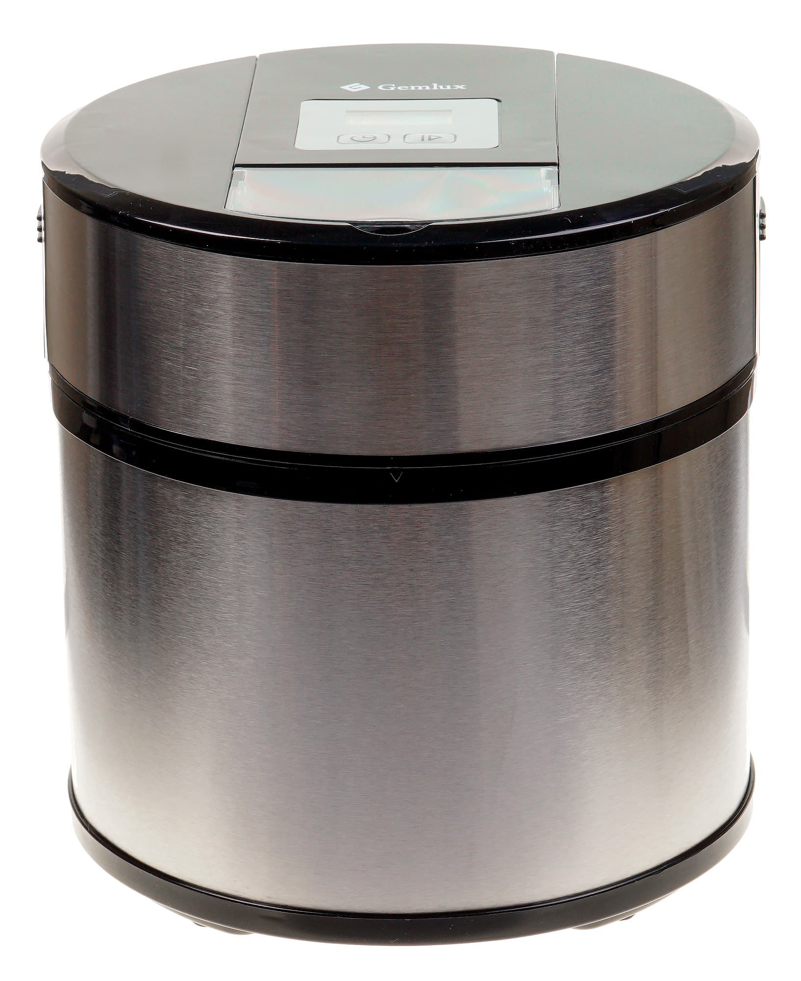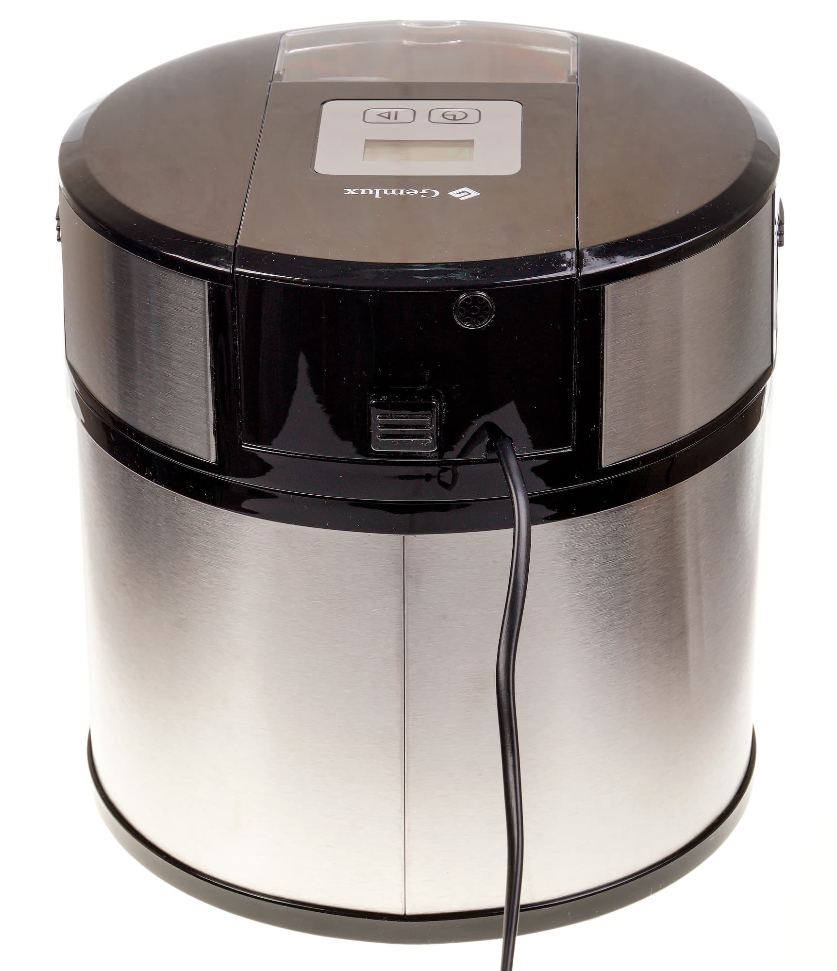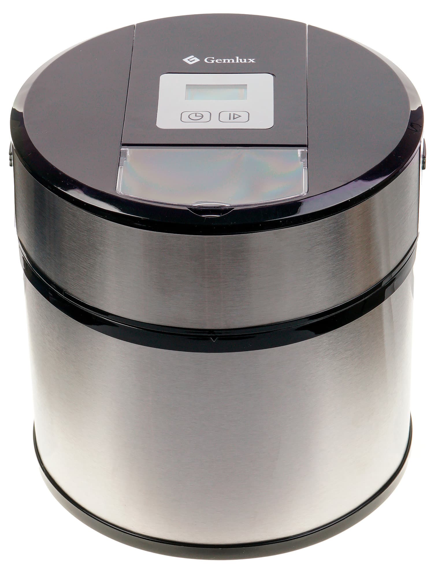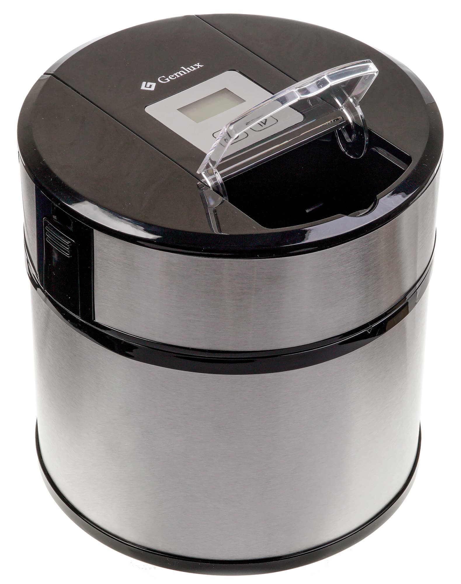 Фризер GemluxGL-ICM1512 в полном сборе — это широкий и низкий цилиндр из нержавеющей стали и черного пластика, причем стали гораздо больше, а пластика меньше. Внешний корпус прибора состоит из крышки и нижней части.