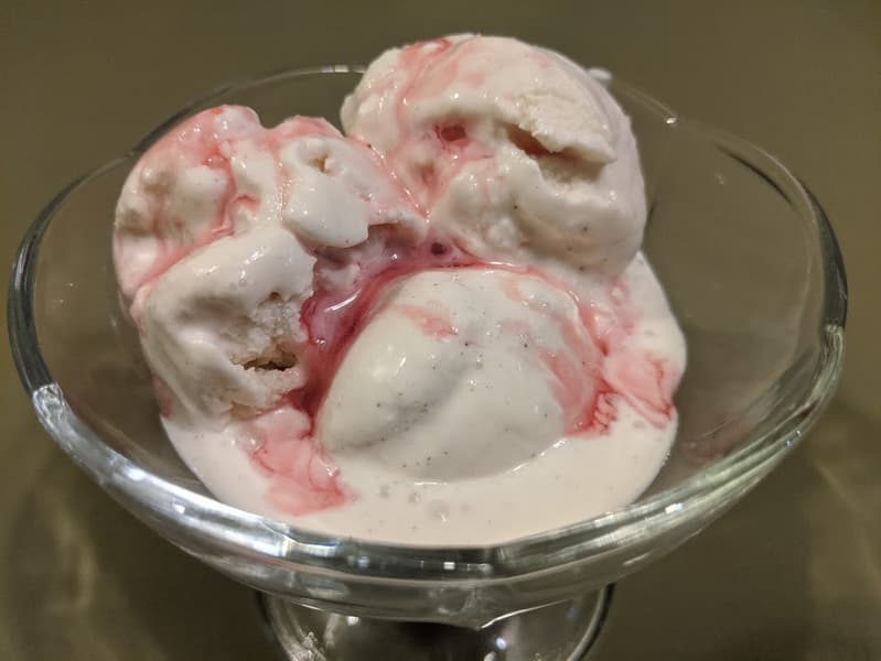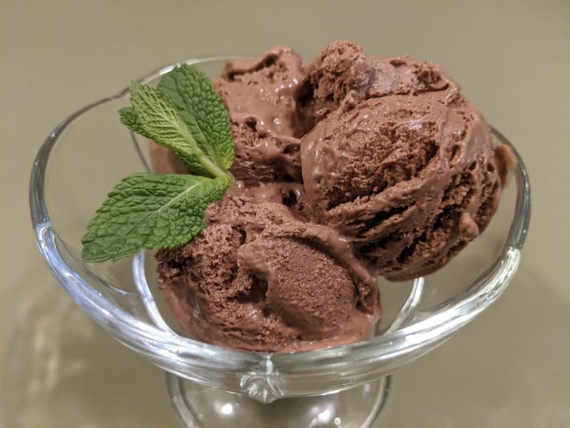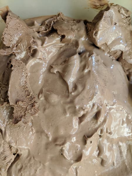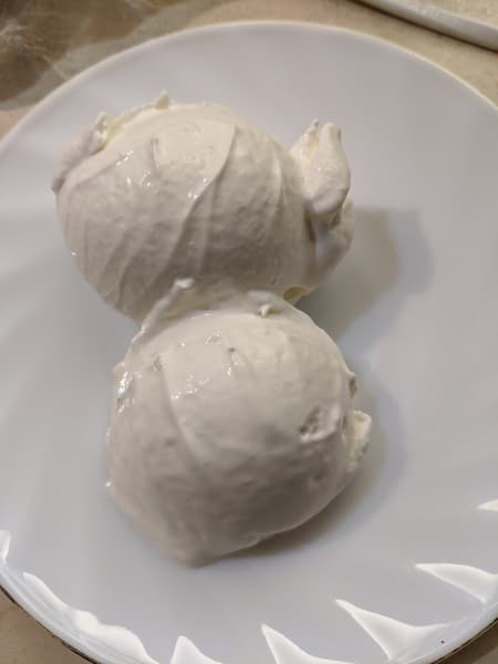 Мороженое можно подать сразу после выгрузки из чаши (оно выглядит как «мягкое мороженое» из соответствующего автомата) или довести в морозилке до привычного нам вида: оно хорошо перемешано, насыщено воздухом и в дальнейшем замерзает без кристалликов льда и расслоения.