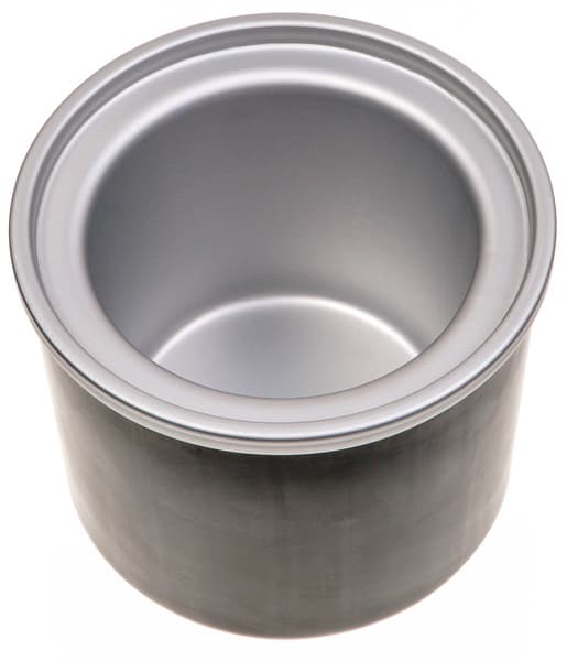 Чаша для смеси емкостью 1,5 литра оказалась тяжелее всех остальных частей фризера. У нее довольно толстые двойные стенки, между которым залита жидкость-хладагент. Внутренние стенки чаши и ее закругленные края сделаны из металла, который легко поцарапать, так что с ней надо быть бережнее, особенно при вынимании из нее содержимого. Внешние стенки — из черного пластика.