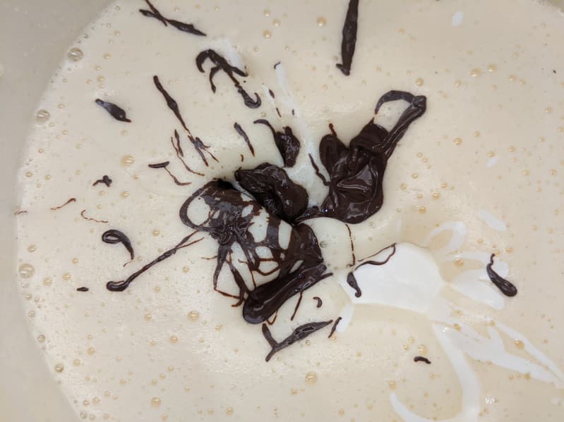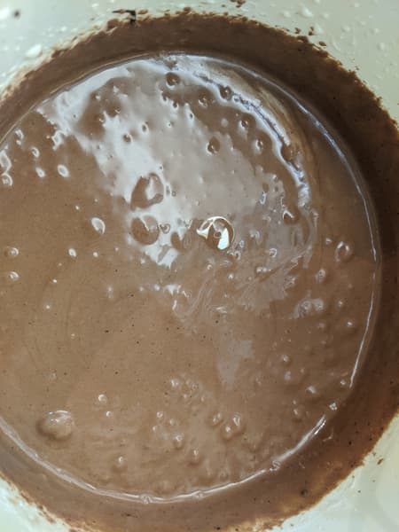 Шоколад растопили — можно сделать это на водяной бане, а можно нагреть его в микроволновке. Мы выбрали второе, а пока шоколад плавился, взбили яйца с сахарным песком, добиваясь, чтобы смесь стала белой, густой и в несколько раз больше. Сам рецепт примитивен, но вот взбивать придется много.