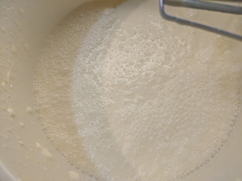 Мы решили приготовить пломбир по классическому рецепту. Для этого 150 граммов сахара взбили с тремя желтками добела и добавили 150 граммов теплого молока. Смесь взбивали до тех пор, пока не растворится сахар.