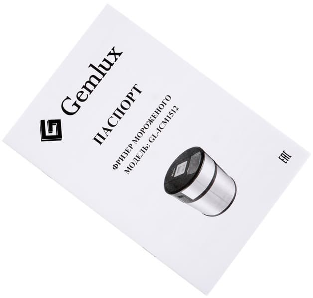 Коробка сделана из картона традиционных для Gemlux цветов: черного и бирюзового. Крупное изображение прибора, который находится внутри, расположено на двух противоположных сторонах (на фоне размытой фотографии двух поваров, колдующих, видимо, над изготовлением пломбира). Здесь также указывается мощность фризера — всего 12 Вт.