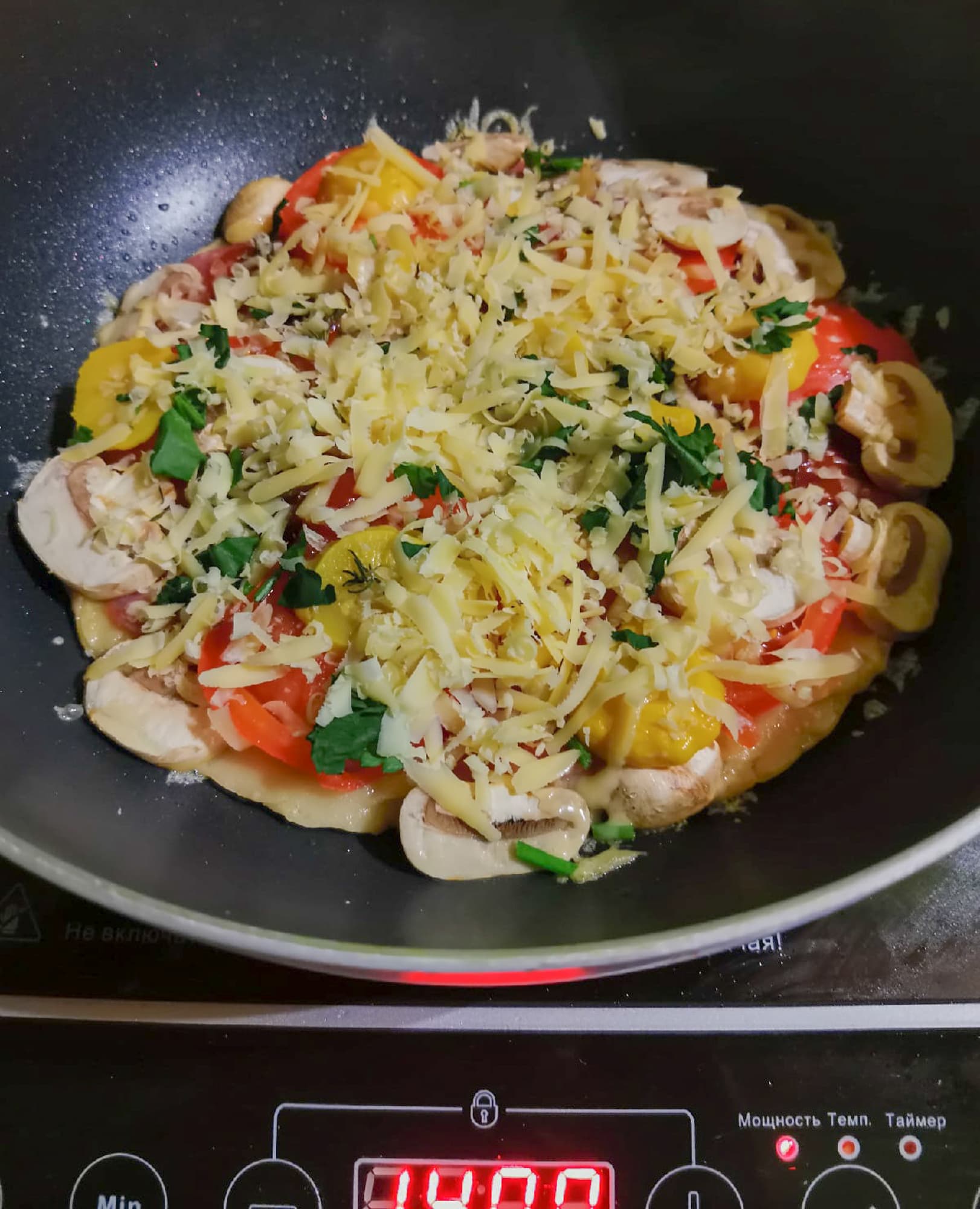 Дождались прожарки основы, досыпали сыра, сбрызнули водой края, закрыли крышкой, подняли мощность до 1400 Вт, подержали 1-2 минуты до готовности.