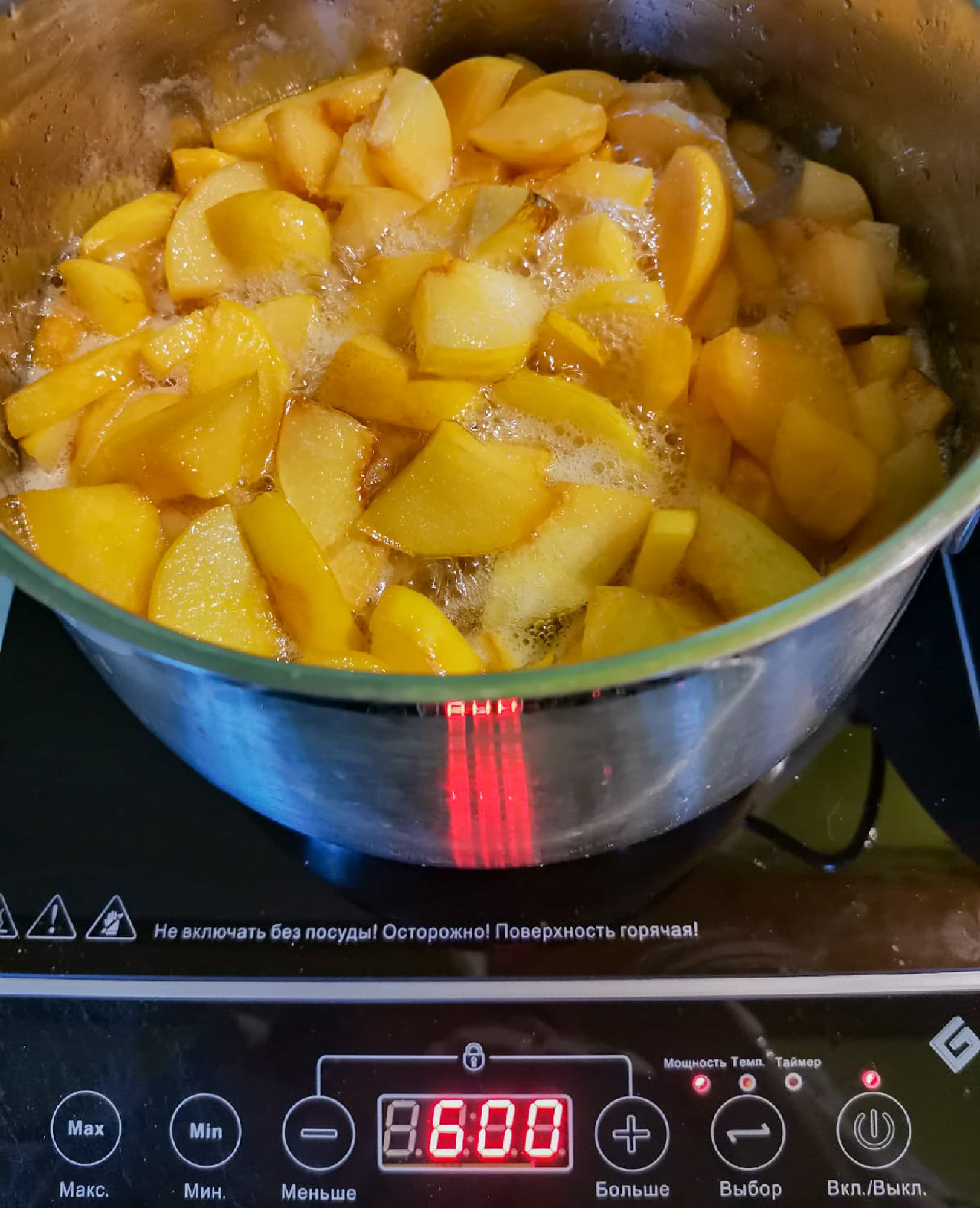 После того, как айва провела в кипящем сиропе некоторое время, мы уменьшили настройки до 600, а потом и до 400 Вт и оставили ее вариться на 1-1,5 часа.