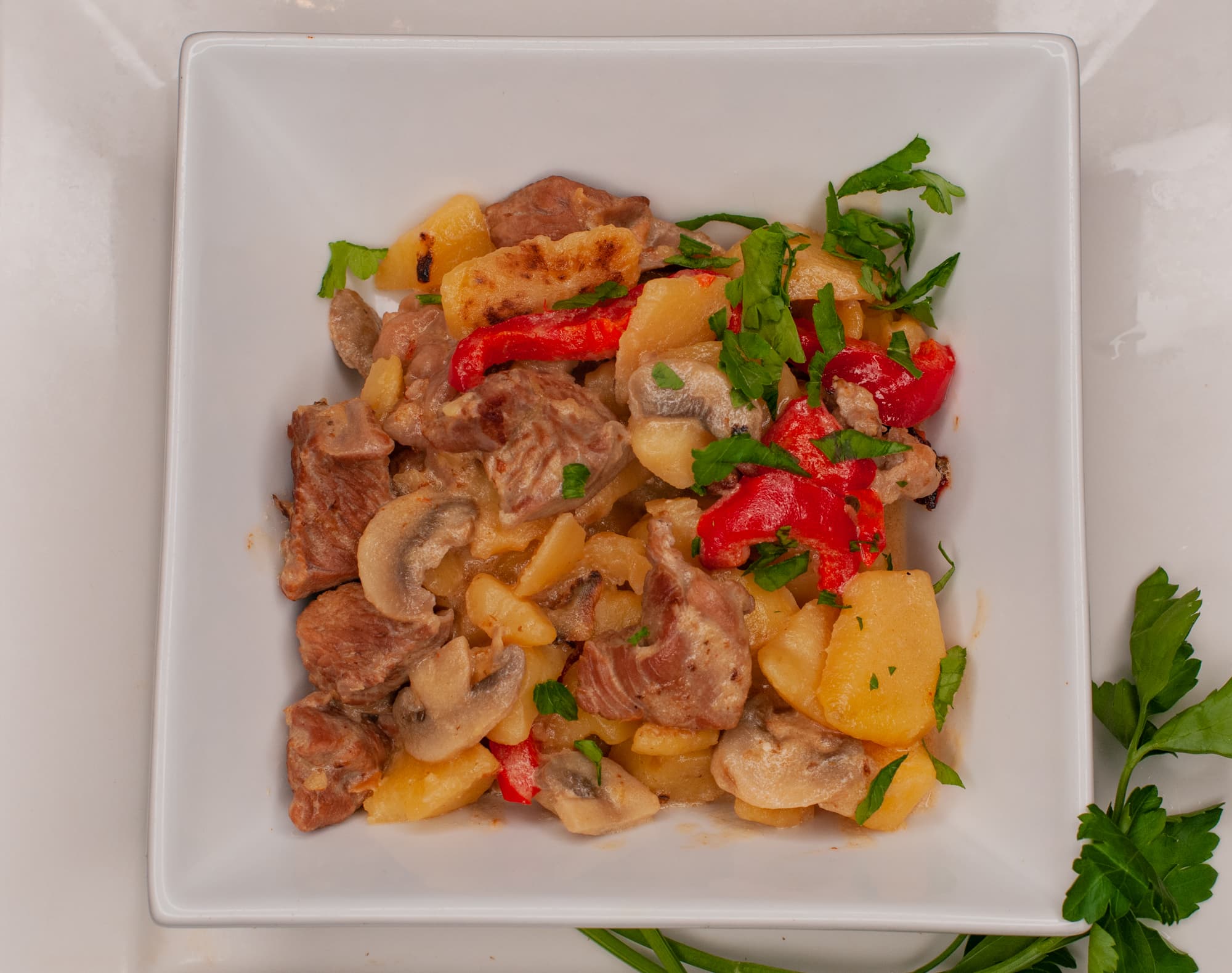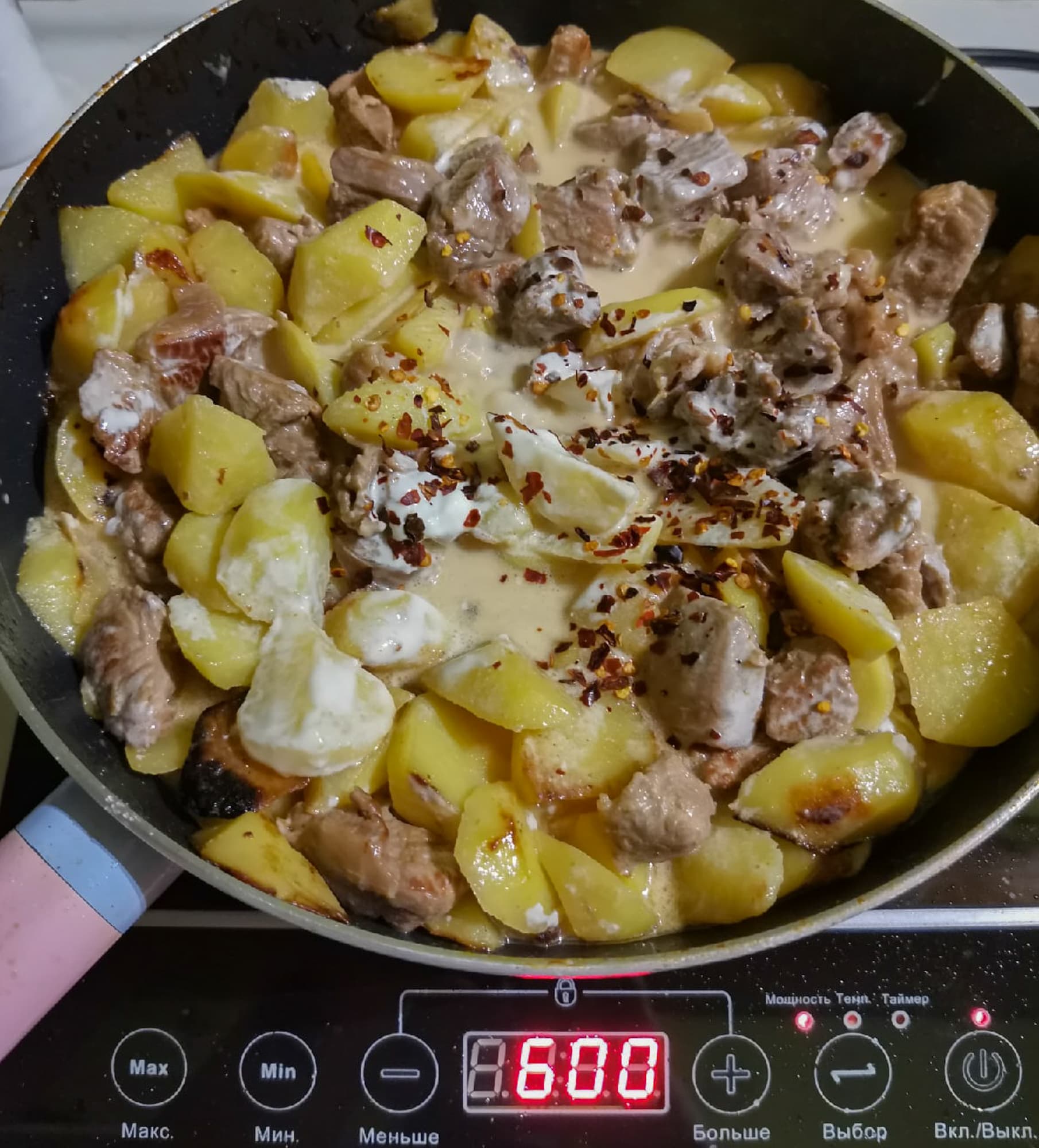 Довели до полуготовности, смешали с подготовленной индейкой, залили сметанным соусом, положили специи и держали под крышкой на малой мощности до полного приготовления рагу (около 1,5 часов). За 30 минут до готовности добавили перец и шампиньоны.