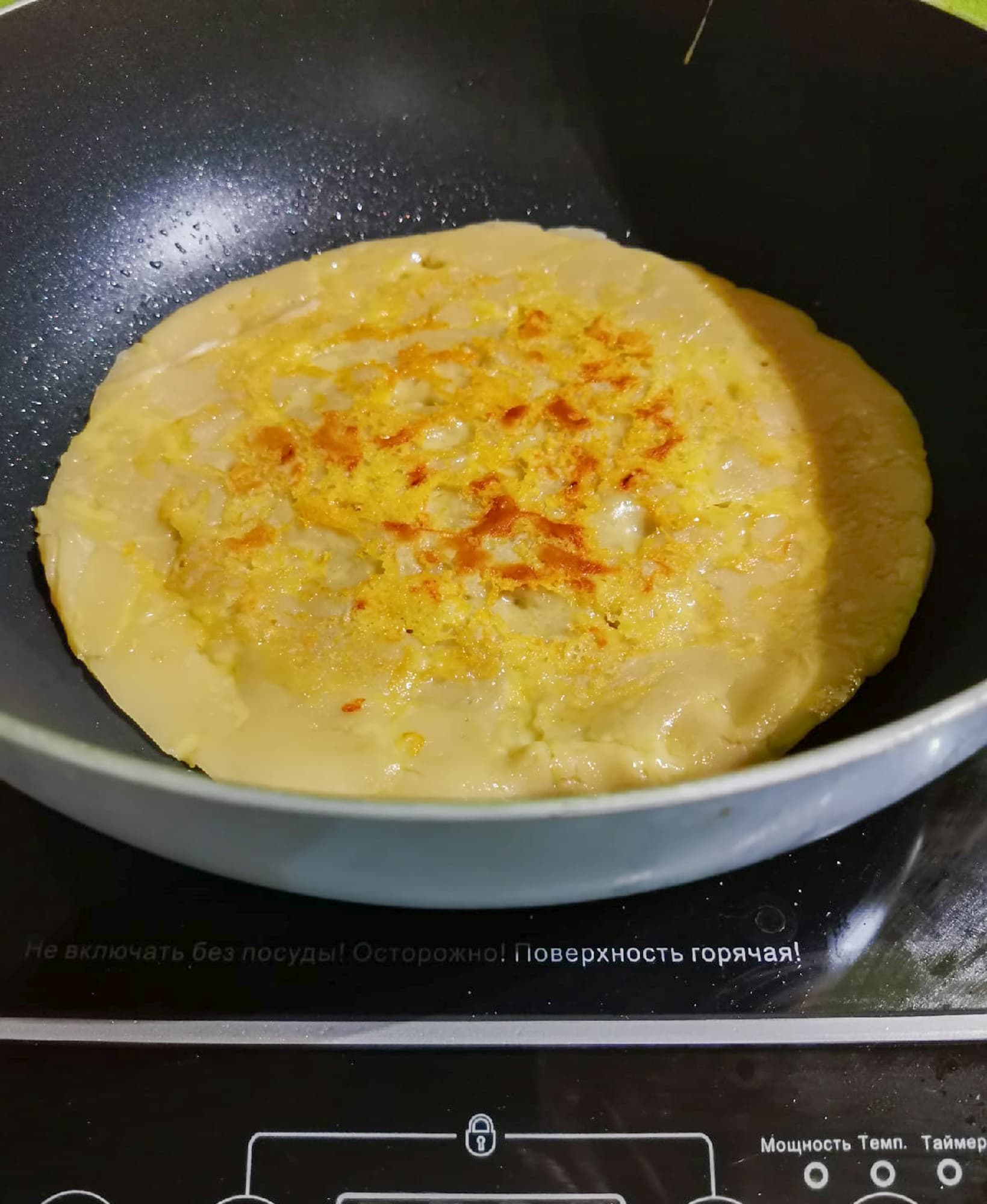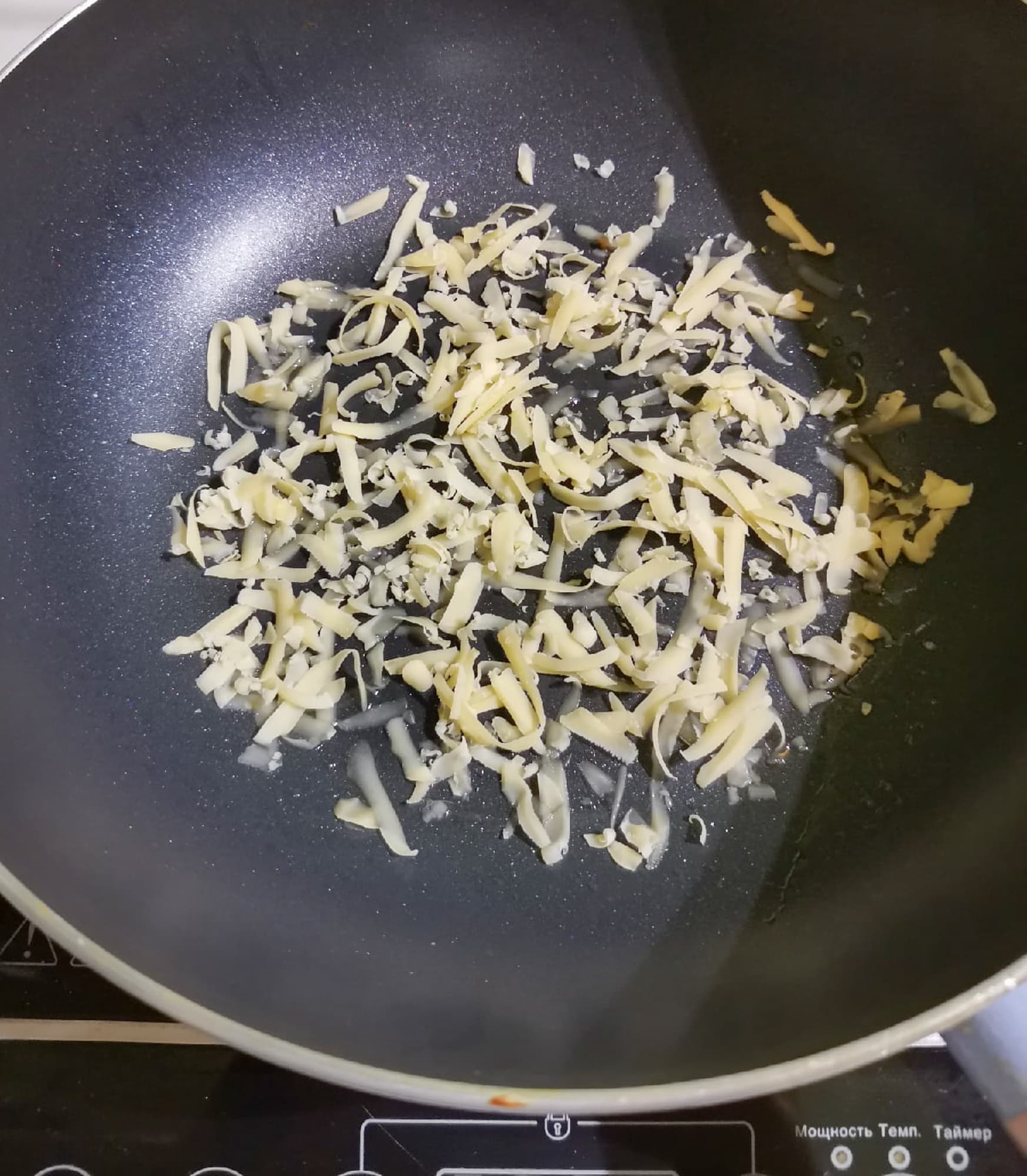 На холодную сковородку мы положили сыр, поставили на большую мощность и вылили на сыр тесто из яиц, муки и кефира.