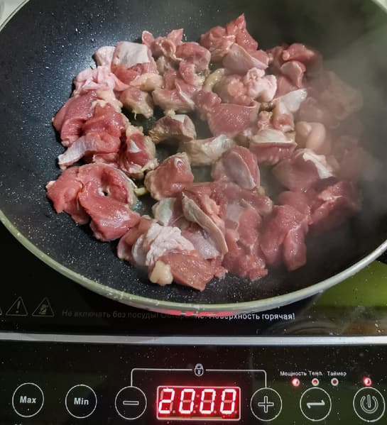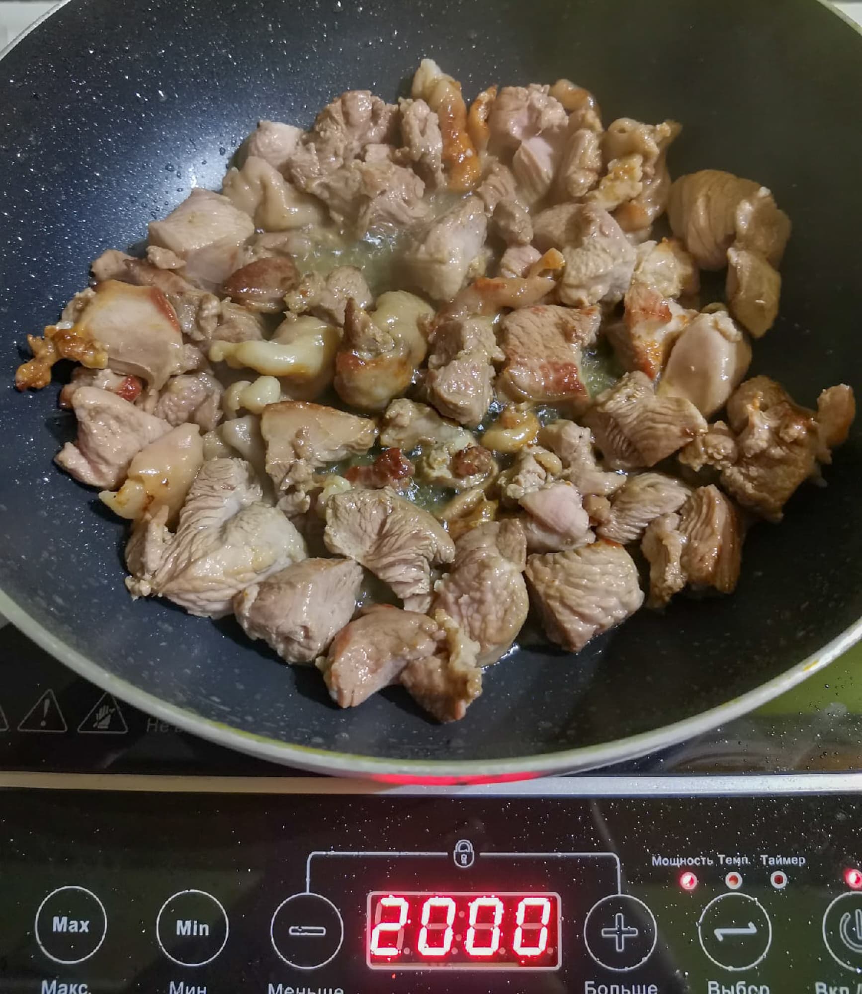 Мы взяли мясо бедра индейки, нарезали и обжарили до корочки на самой высокой мощности.