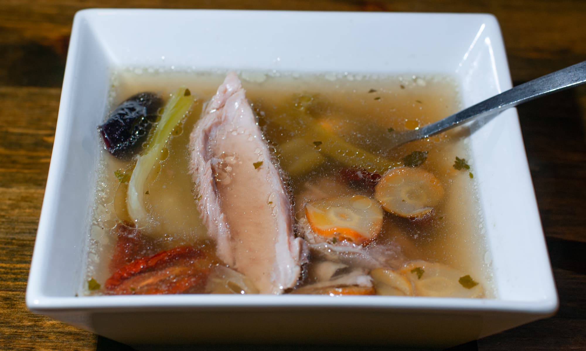 По прошествии этого времени мы получили прозрачный бульон и мясо, легко отделяющееся от костей. В бульон мы положили сушеные овощи: морковь, помидоры и пастернак, зелень, копченый острый перец и несколько сушеных слив.