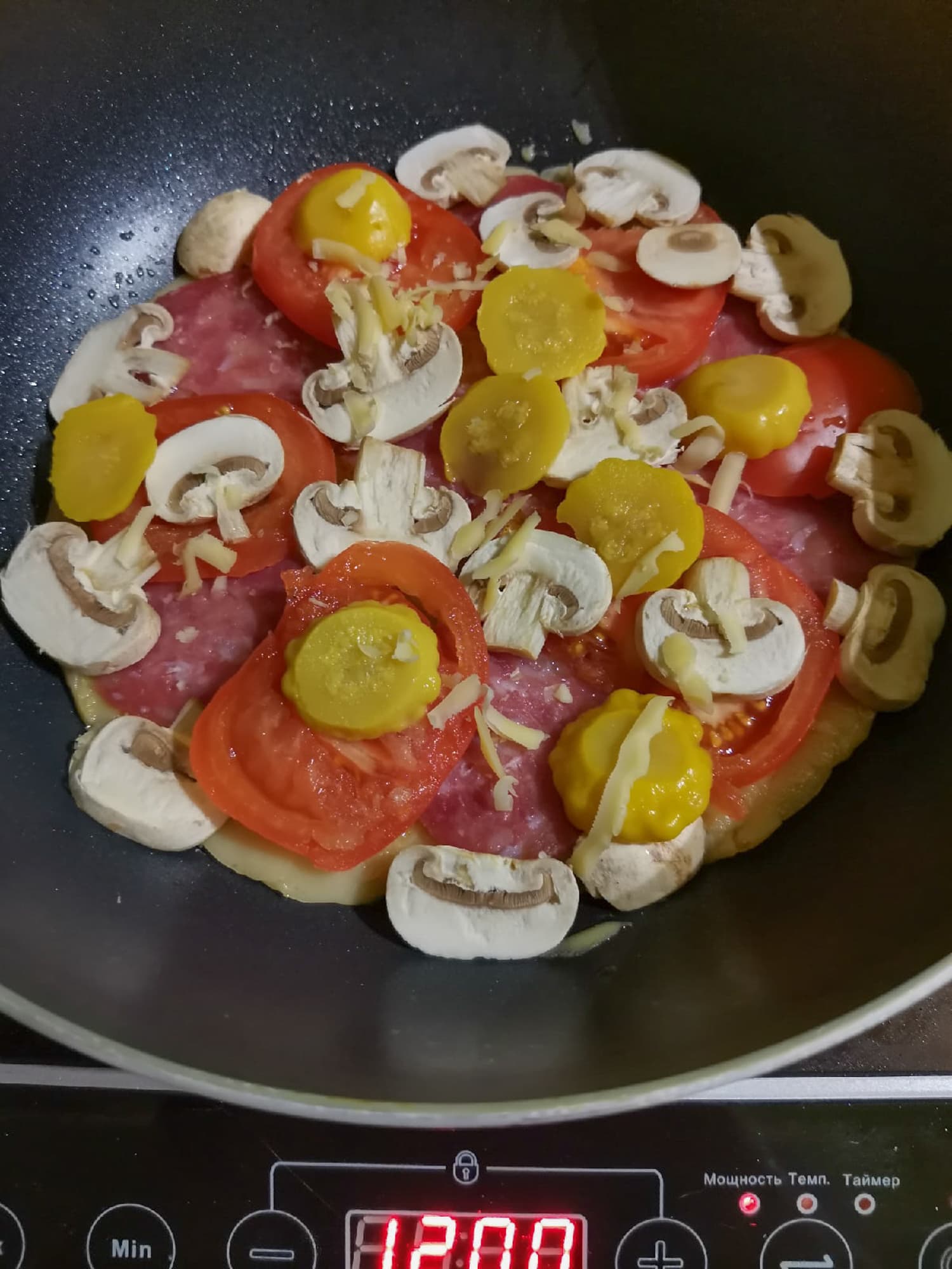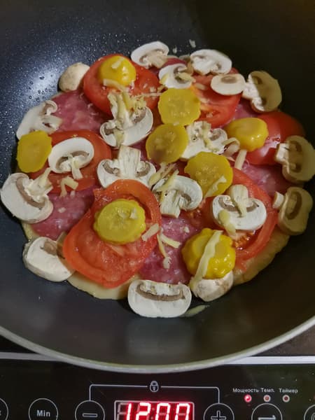 На основу положили колбасу, грибы и овощи, закрыли крышку, выставили 1200 Вт.