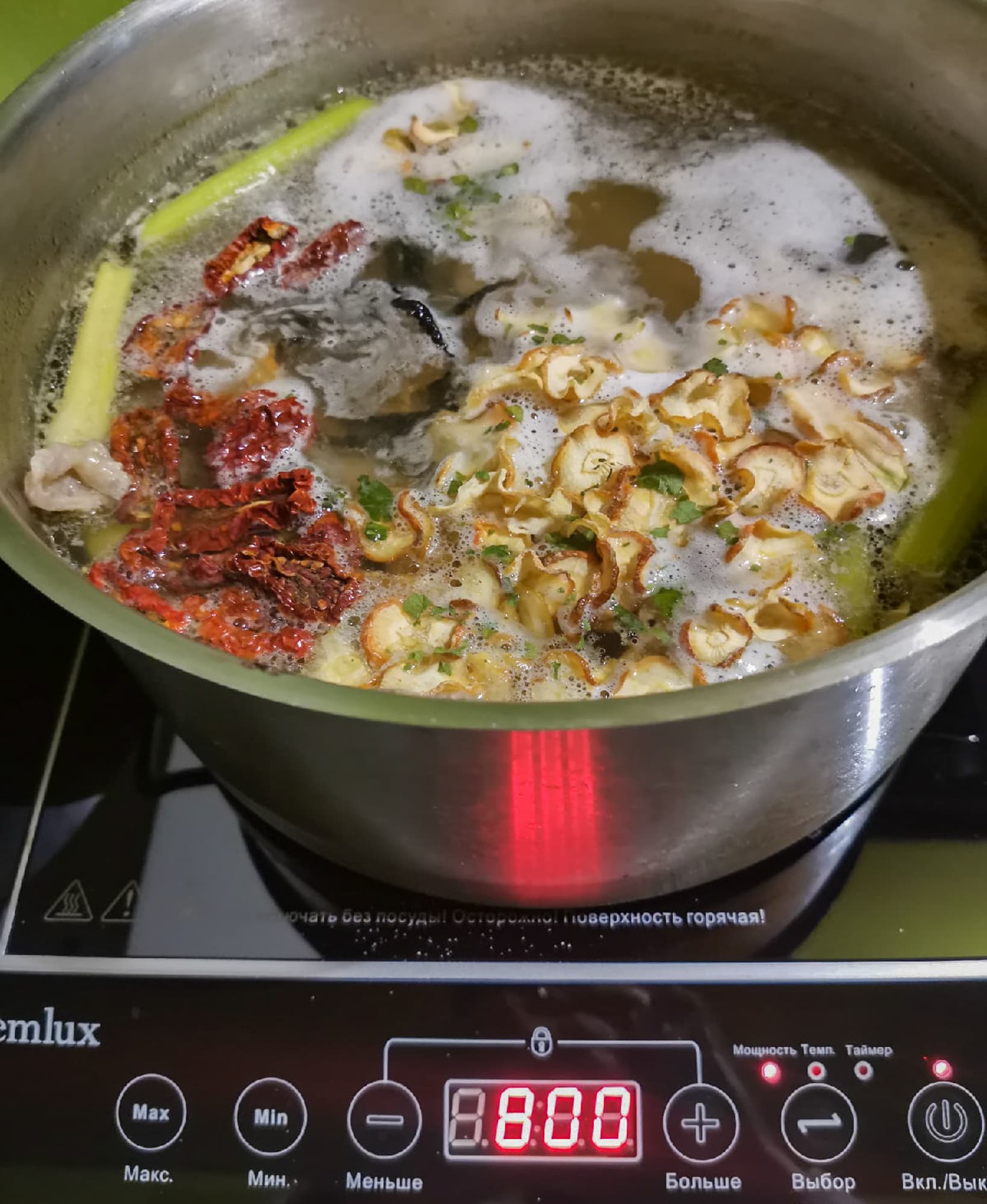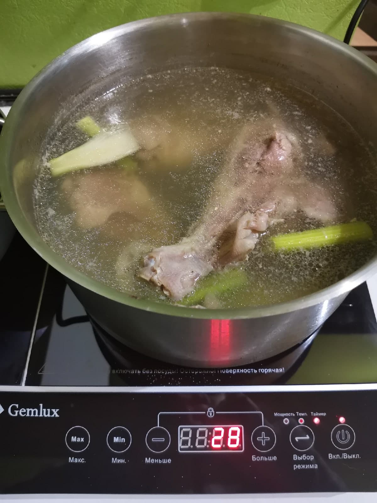 Сначала мы сварили бульон из ног индейки. Для этого мы взяли кастрюлю 8 литров, 4 ноги индейки и немного сельдерея. Поставили вариться при мощности 1000 Вт, а после начала закипания уменьшили мощность до 600 Вт, оставили на 4-5 часов.