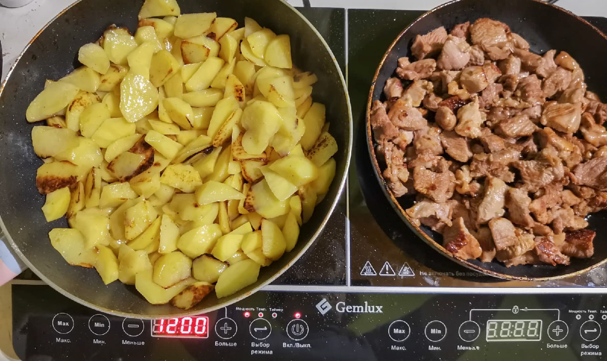 Сырую картошку обжарили, перемешивая, на сковороде до корочки на мощности 1400-1200 Вт.