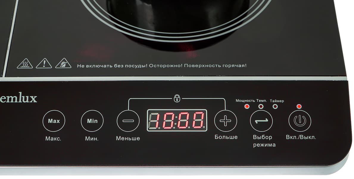 Справа и слева от дисплея находятся клавиши больше и меньше, с помощью которых производится установка таймера, мощности и времени. После клавиши «больше» справа находится клавиша выбора режима, она так и подписана, над ней три световых индикатора: мощность, температура, таймер, которые указывают на используемый режим работы. При однократном нажатии кнопки «выбор режима» на светодиодном экране отобразится предварительная настройка мощности по умолчанию — правая 1000 Вт, левая 1200 Вт, при этом устройство включится. Далее кнопками «+» и «−» можно изменить настройки мощности. Выбранная настройка отобразится на дисплее. Если на конфорке будет стоять несоответствующая посуда или посуда будет отсутствовать, на дисплее появится код ошибки «Е1».