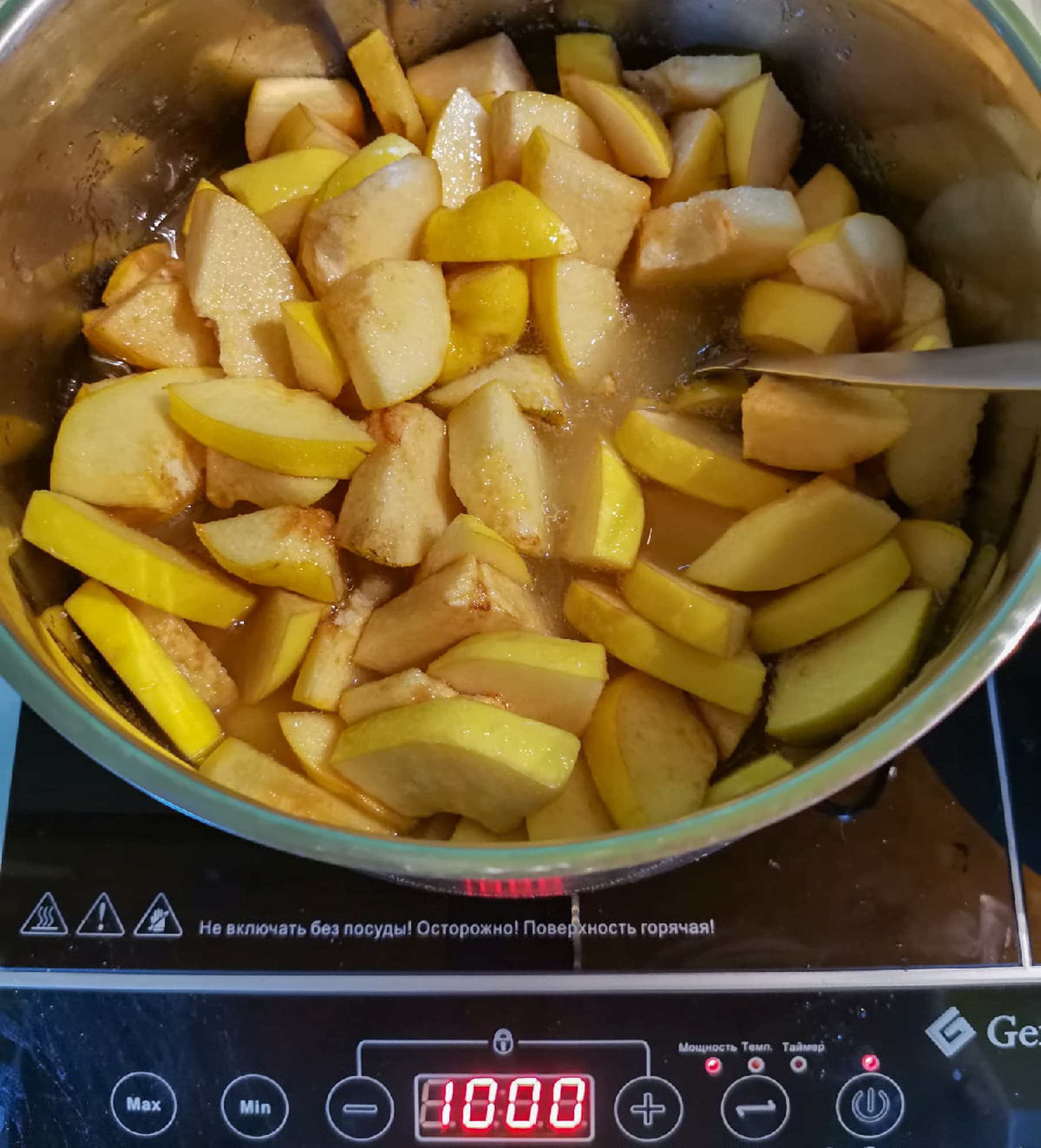 Приготовили сахарный сироп из сахара с добавлением воды. В кипящий сироп засыпали айву, постоянно мешая и меняя мощность, чтобы кипение было, но сироп не брызгался.