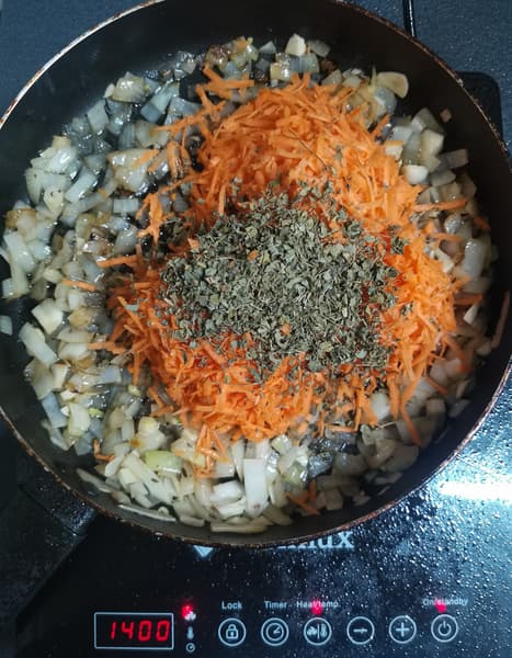 Отдельно обжарили лук, добавили морковь, пажитник, зиру и специи.