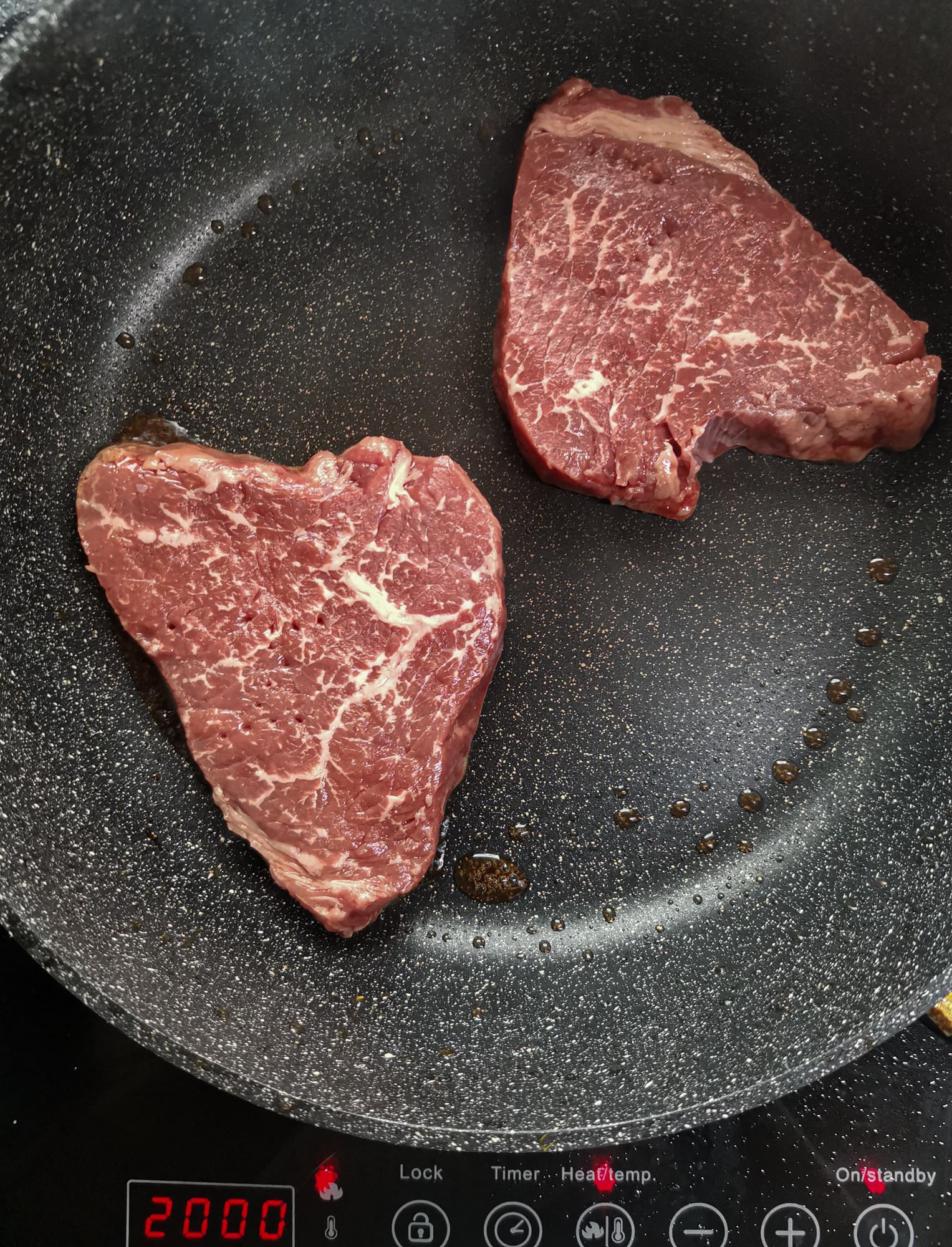 Подготовленный стейк выложили на сильно разогретую сковородку, продолжили готовить при максимальной мощности.