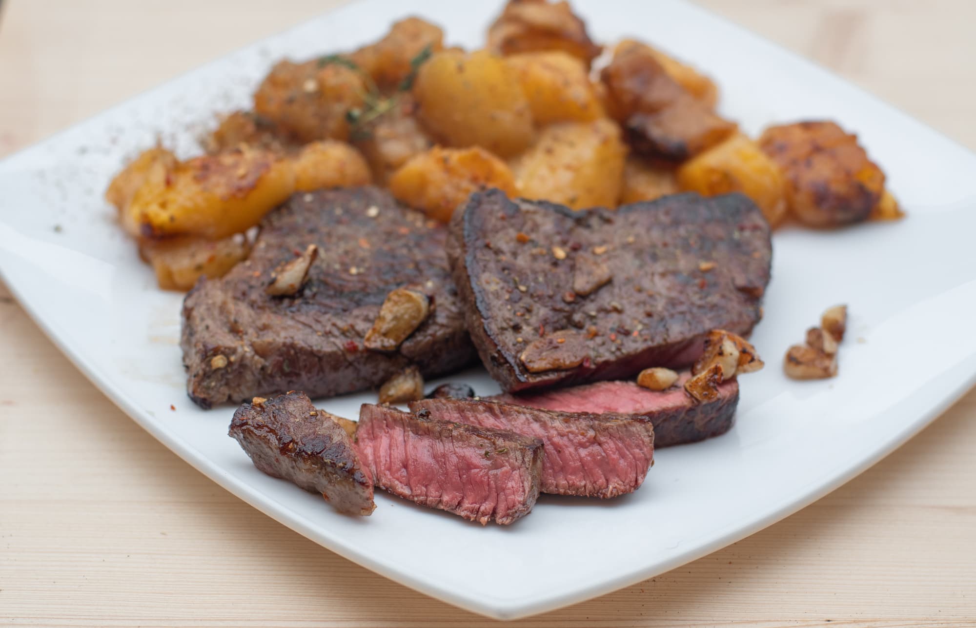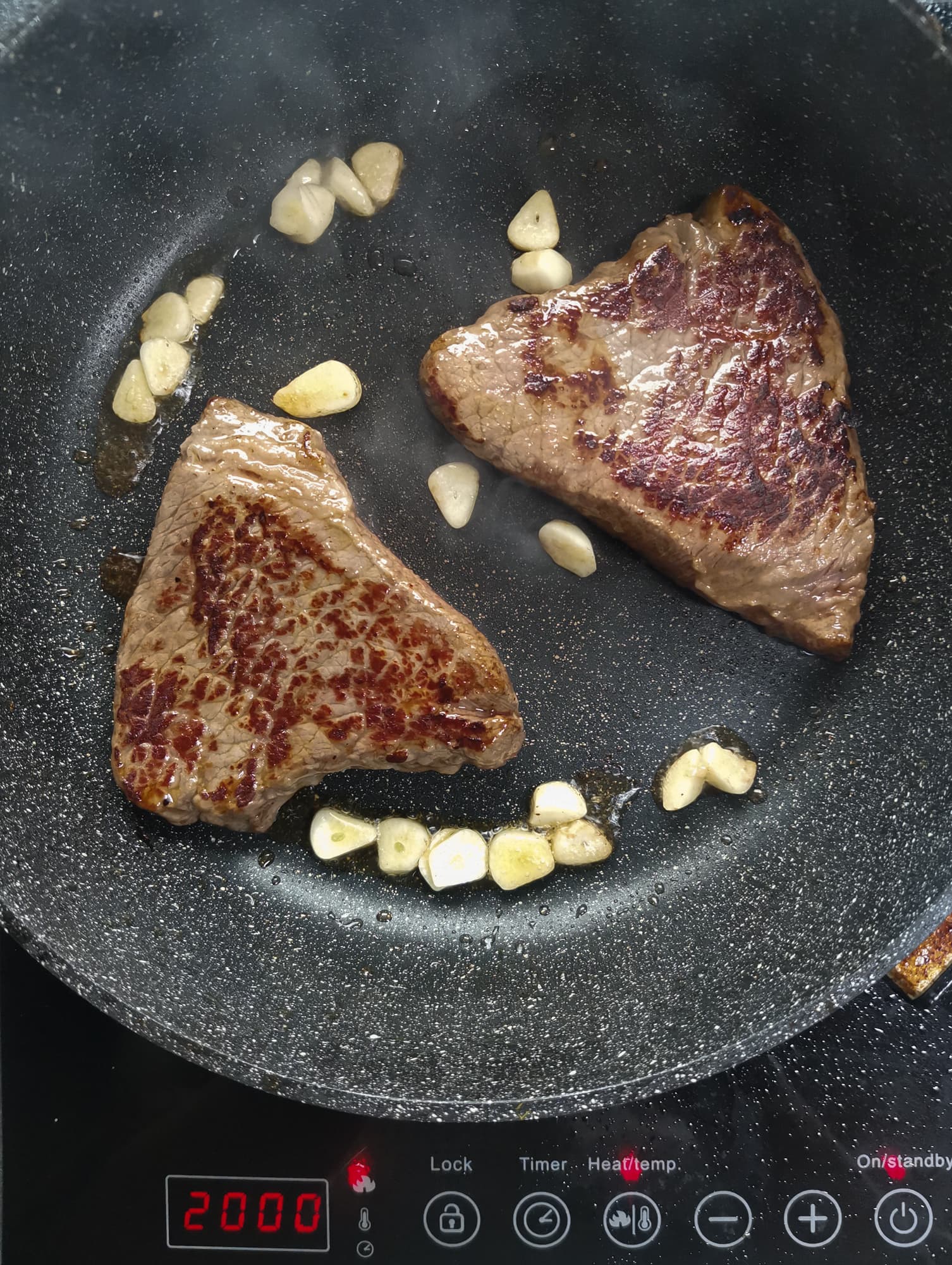 Обжарили с двух сторон до образования корочки, положили чеснок, подержали куски стейка еще минуту на сковороде, затем выложили отдохнуть.