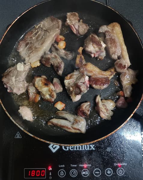 Для плова мы поджарили баранину на курдючном сале до золотистой корочки.