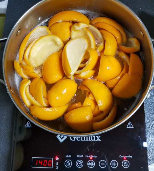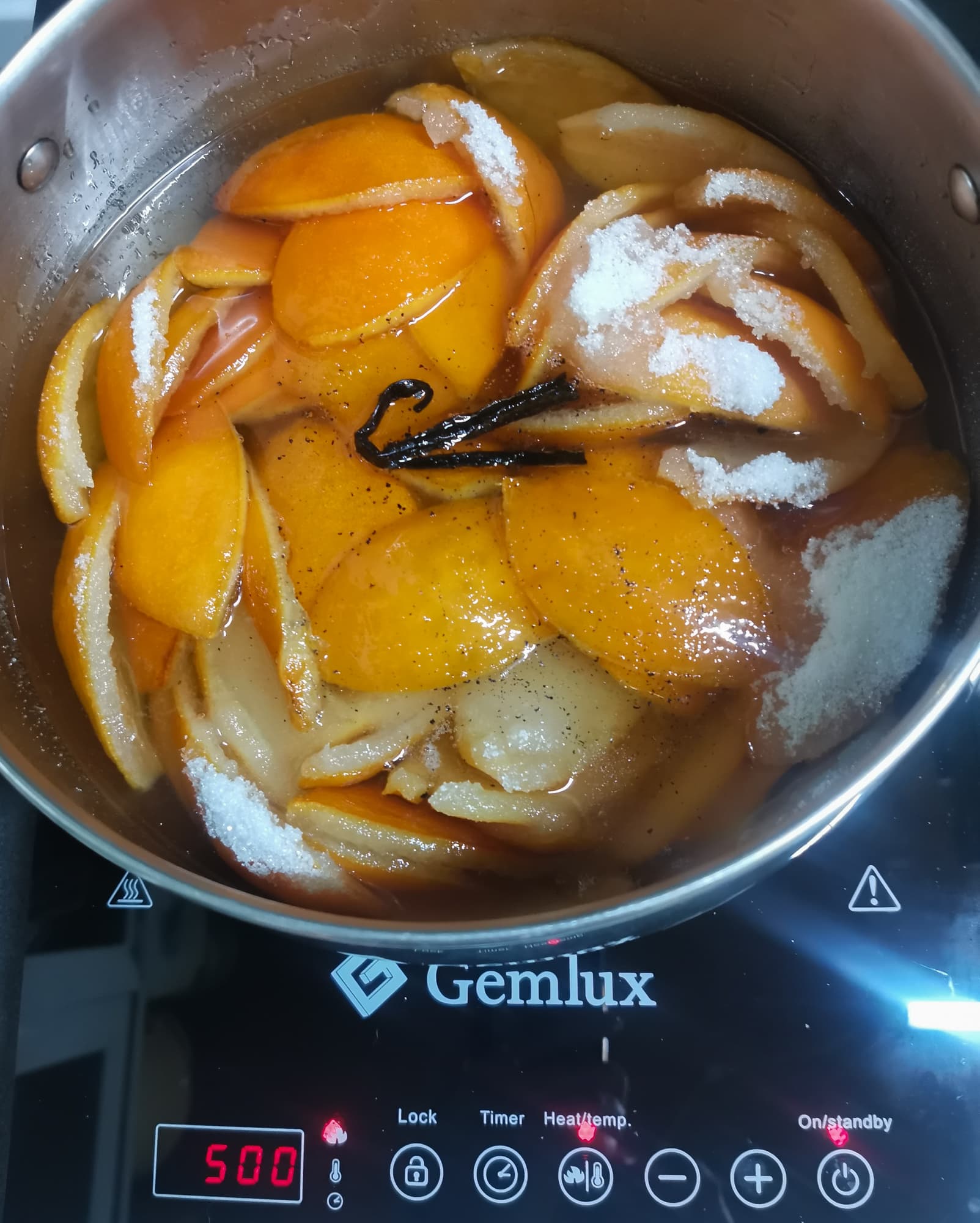 Загрузили в него заранее подготовленные апельсиновые корки. Довели до кипения.
