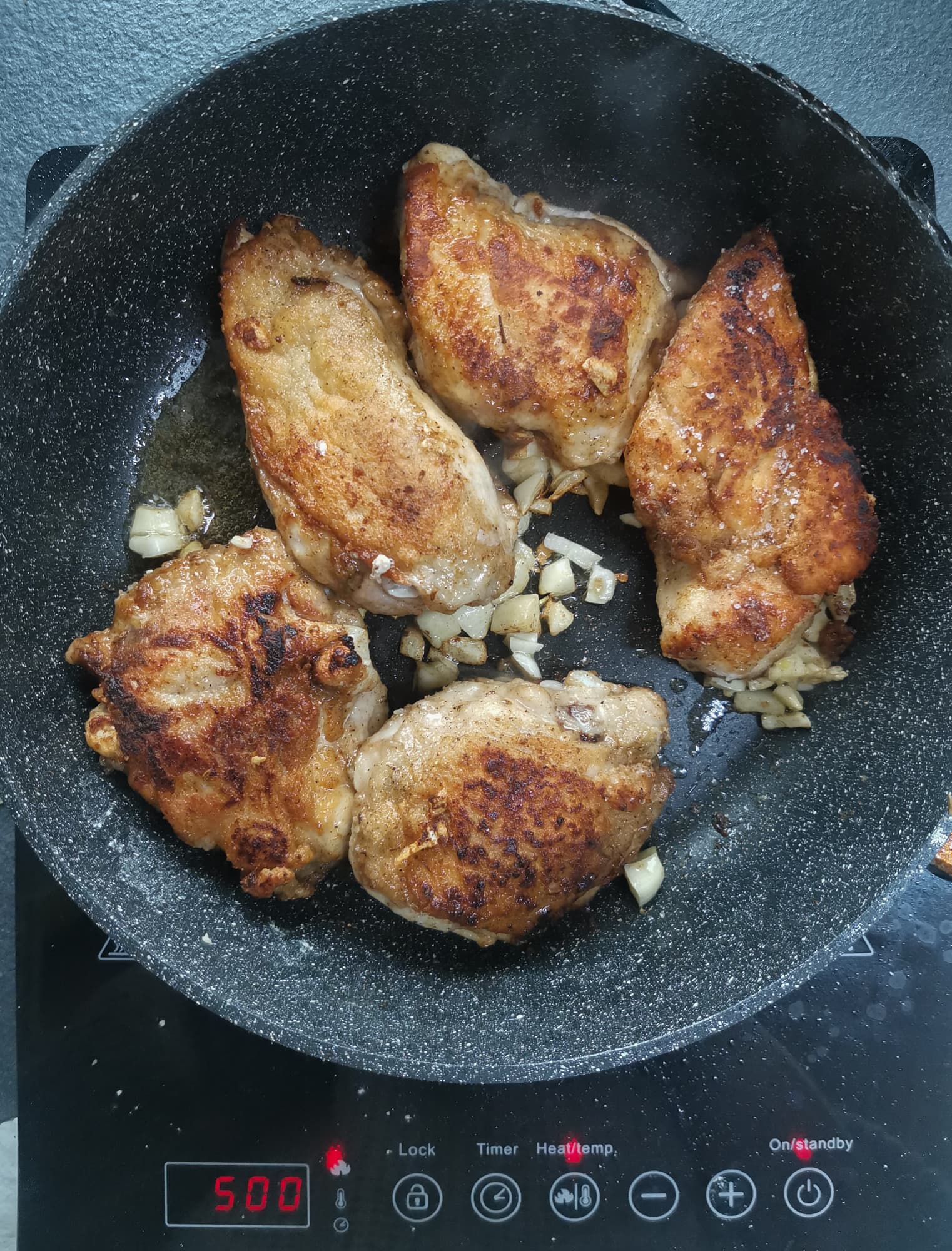 Куриные грудки обваляли в муке со специями, обжарили с чесноком до золотистой корочки на высокой мощности. Затем оставили на несколько минут, убавив мощность до 500 Вт, чтобы курица равномерно прожарилась внутри.