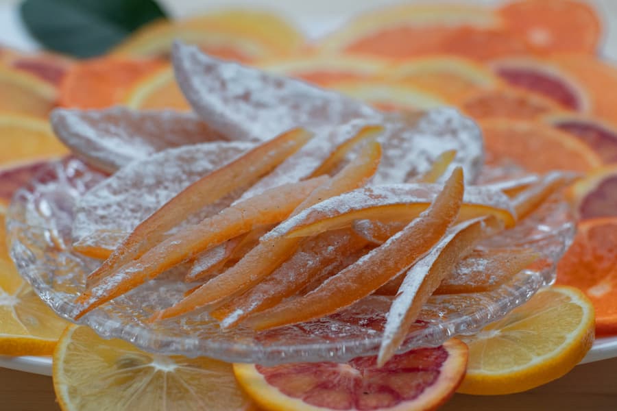 Варили около часа, подбирая мощность так, чтобы кипение было очень слабым. Выровняли количество сахара, добавили стручок ванили. Продолжили на самой низкой мощности, выставив таймер и доведя корочки до полупрозрачного состояния.