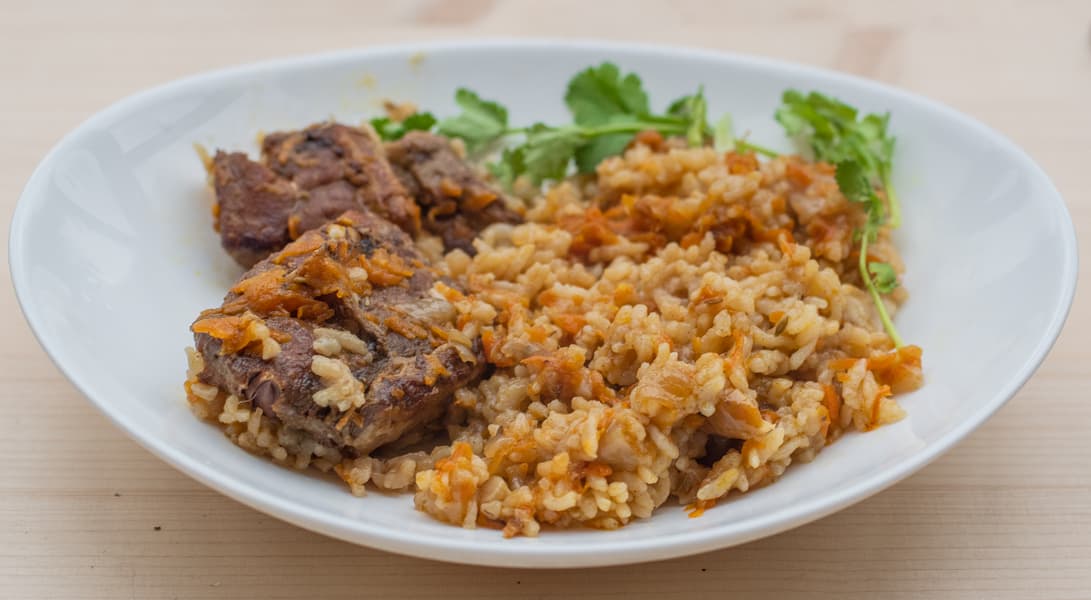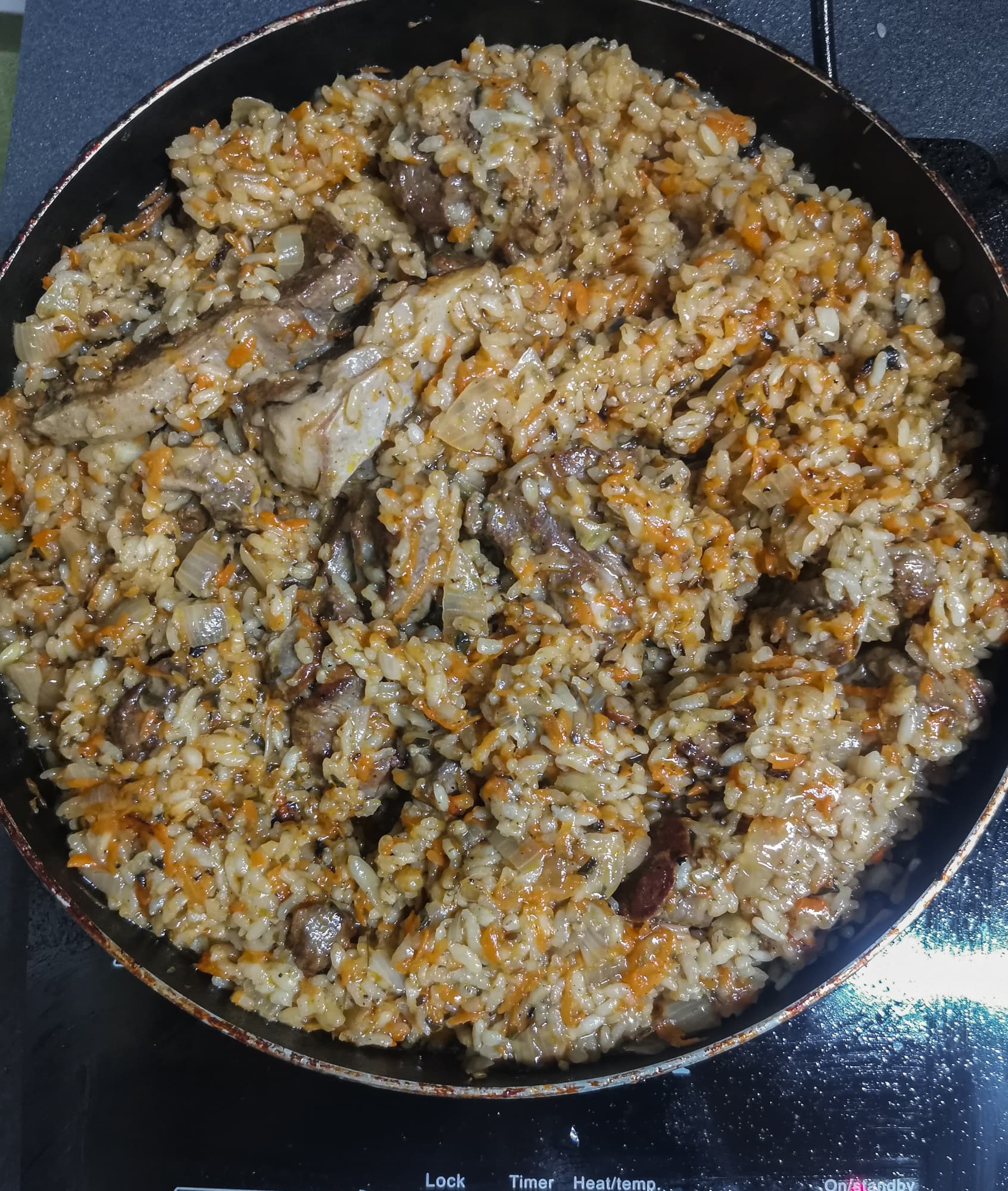 Через 20 минут плов был готов. Мясо и овощи оказались в отличной кондиции, а вот с количеством воды мы не угадали, рис получился разваренным. Мы перемешали блюдо и подержали плов без крышки еще несколько минут, дав ему «дойти».