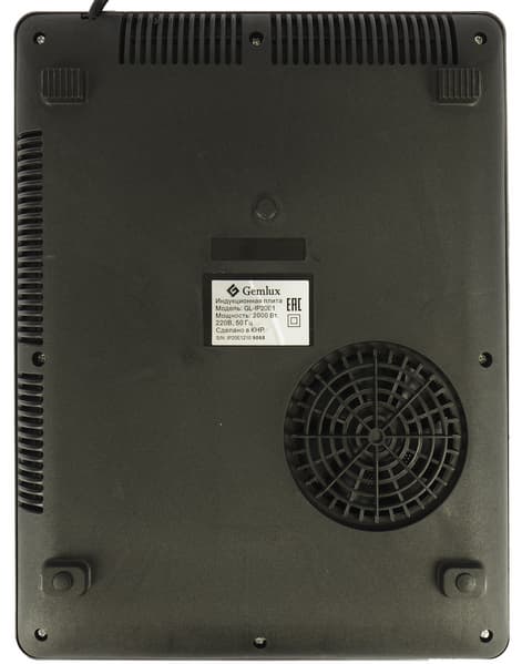 Плитка стоит на 4 устойчивых ножках. Снизу корпуса наклейка с серийным номером и техническими характеристиками, а также решетка вентилятора.