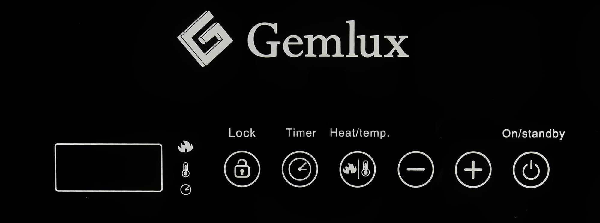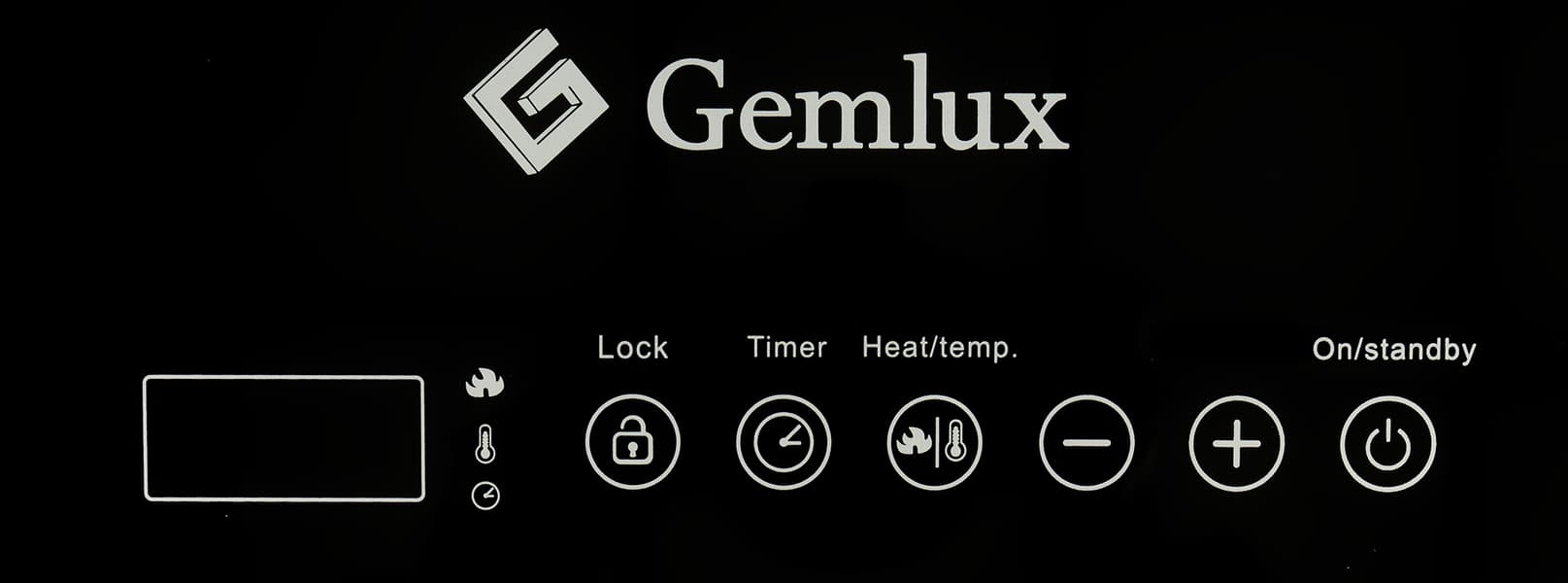 Панель управления состоит из дисплея и сенсорных кнопок. Отдельная кнопка управляет блокировкой панели управления, следующая кнопка направо — таймер. Время можно установить в диапазоне от 0 до 180 минут с шагом в 5 минут. Установка производится кнопками «+» и «−». Кнопка «Heat/temp» отвечает за выбор отображения режима работы в ваттах или градусах. По умолчанию при включении прибор начинает работать при 1800 Вт мощности. Если режим работы нужно задать в градусах, то кнопкой «Heat/temp» следует переключить режим и кнопками выбора «+» и «−» установить желаемую температуру.