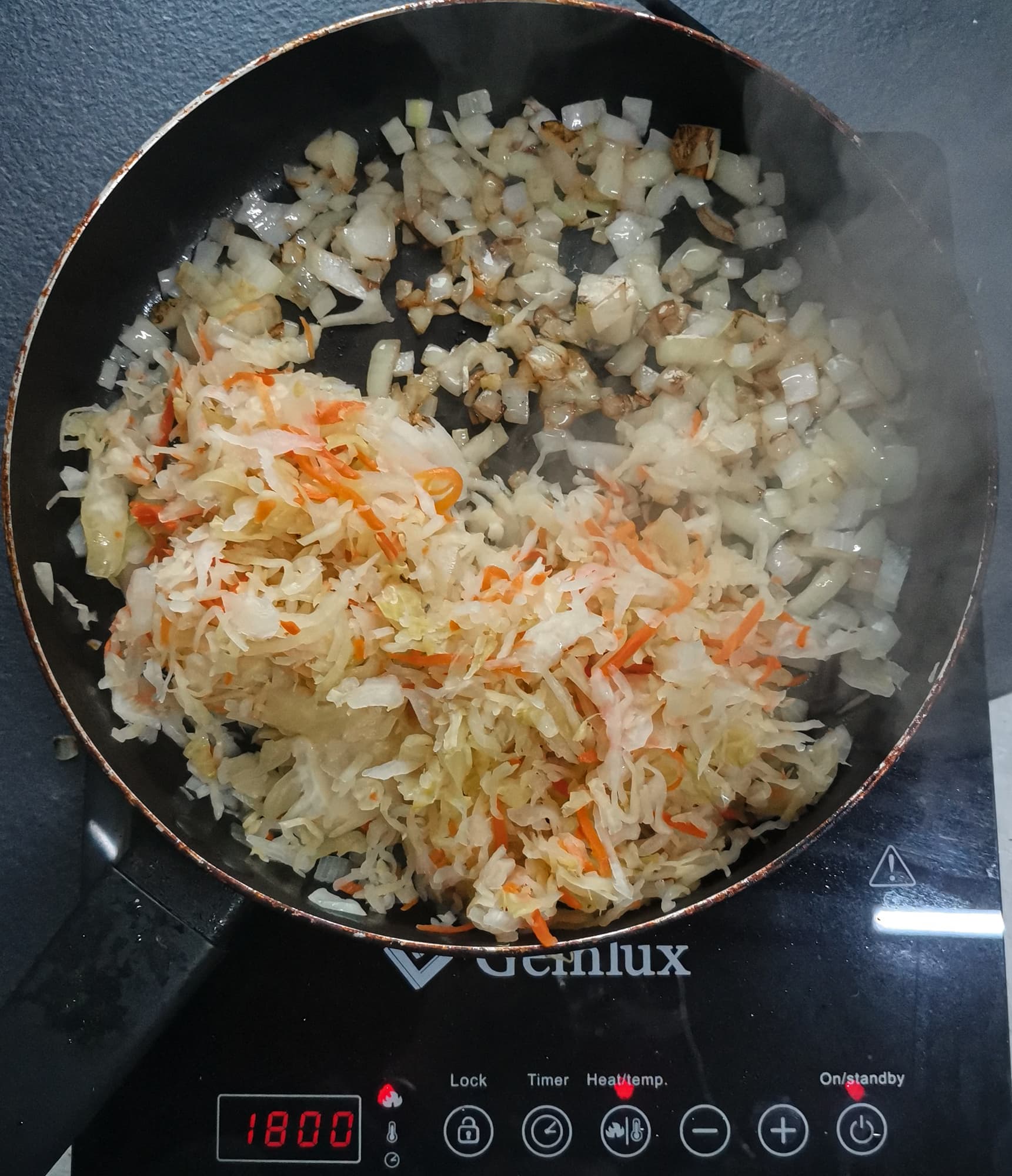 Добавили к луку капусту с морковью, специи, соль. Тушили около 15 минут, периодически подливая воду.
