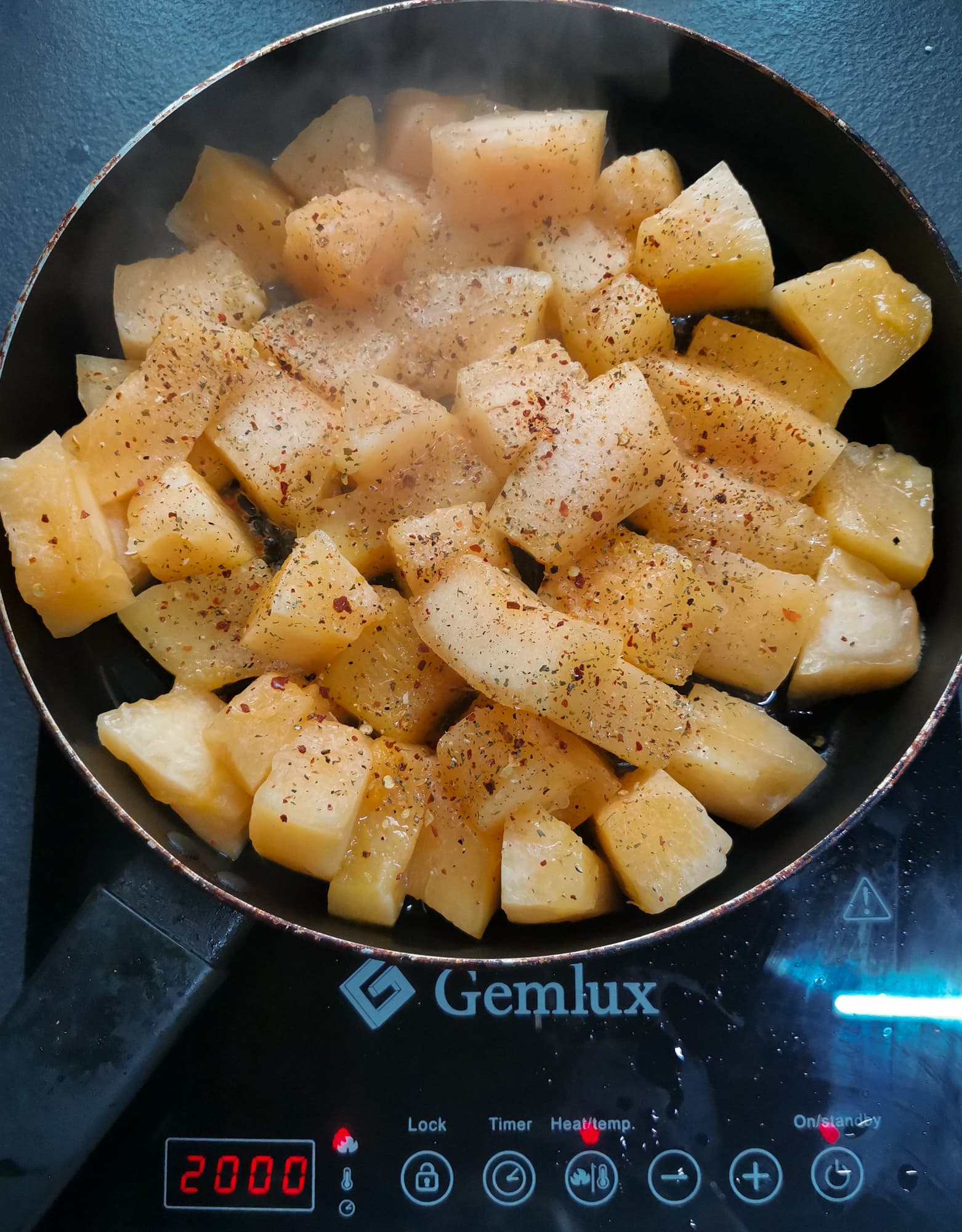 Замороженную крупными кусками тыкву высыпали на сковородку. Готовили при максимальной температуре со специями и оливковым маслом.