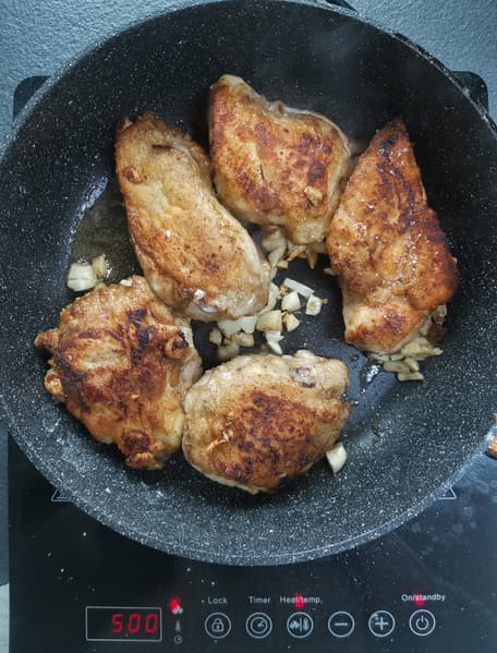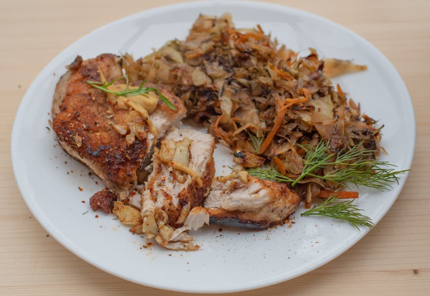 Курица получилась сочной, гарнир не успел остыть в сковородке.