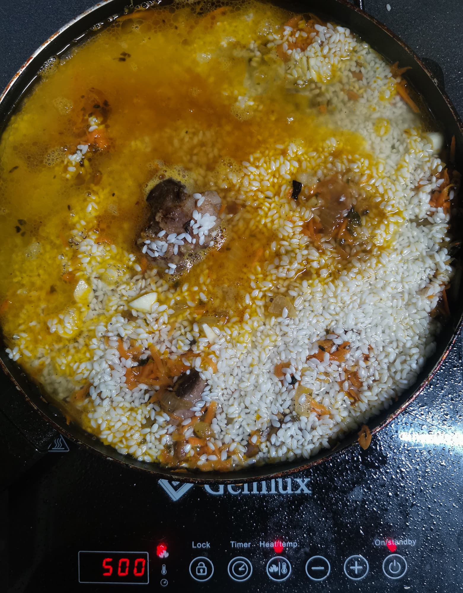 Протушили, соединили с мясом, доложили чеснок, высыпали рис, долили воды. Оставили готовиться под крышкой при минимальной мощности.