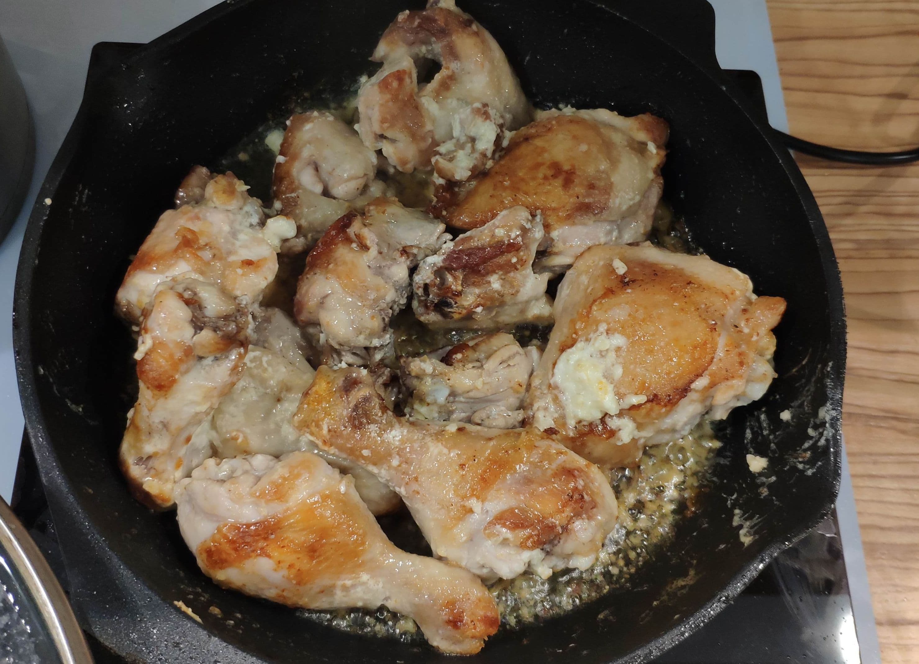 Кожица и мясо быстро приобрели румяную корочку, затем мы перевернули кусочки, дождались характерного золотисто-рыжего цвета на обратной стороне и дали курице полчаса на полное приготовление внутри. По окончании теста мы с удовольствием отметили, что ничего не пригорело.