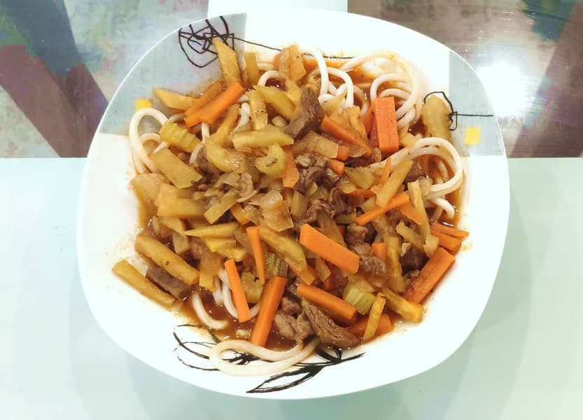 Мы продолжали тушение, наблюдая кипение в центре, где происходит нагрев от катушки, и потому регулярно должны были перемешивать содержимое сковороды. Примерно через 20 минут редька стала мягкой, и можно было варить лапшу и соединять ингредиенты лагмана, приправив соевым соусом и уксусом по вкусу. На наш вкус, блюдо получилось ярким и колоритным, не слишком сложным — и сразу во внушительном объеме, благодаря крупной посуде.