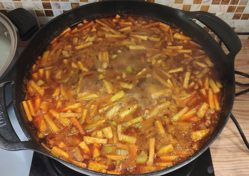 Мы использовали большую чугунную сковороду вок с плоским дном, чтобы быстро обжарить ингредиенты и затем поэкспериментировать со средними температурами для тушения продуктов. Сначала мы разогрели ее с добавлением небольшого количества растительного масла. Мясо взяли жирное, поэтому ничего не пригорело. 800 г говядины обжарили на максимальной мощности, которой, к сожалению, не хватило — кусочки успевали остыть. Это заняло около 4 минут, далее мы добавили 500 г лука и выбрали мощность 800 Вт, чтобы он протушился. Спустя 2 минуты добавили 500 г моркови, продолжили тушение на той же мощности. Спустя 5 минут добавили 700 г редьки, попробовали увеличить мощность. Еще через 3 минуты налили в вок 2 литра воды со 100 г томатной пасты, а через 10 минут в побулькивающую смесь кинули нарезанный стебель сельдерея.