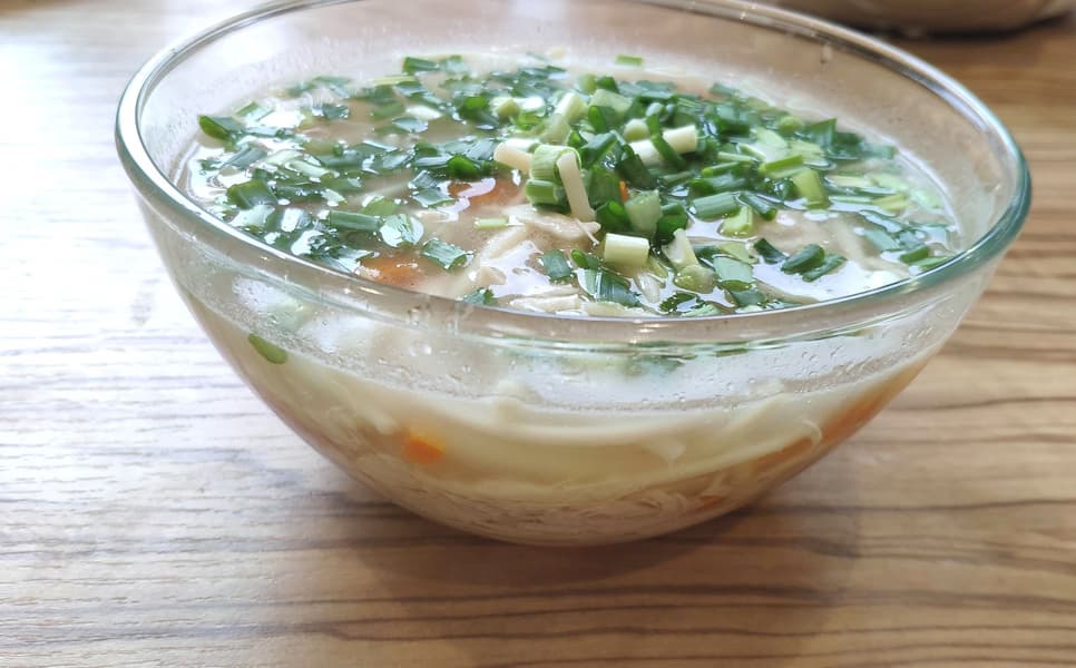 Вареную грудку и морковь мы мелко нарезали, отварили лапшу и приправили полученный куриный суп зеленью — самый что ни есть классический рецепт для человека, в которого не очень влезает еда. Возвращаясь к заметке, на уровне субъективных ощущений тестировщика употребление данного супа действительно смягчает симптомы простуды.