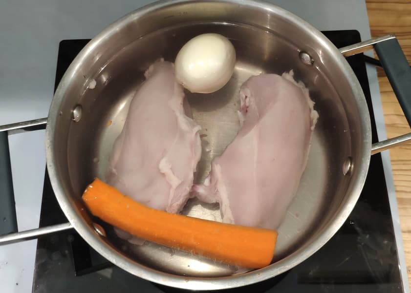 В разгар пандемии мы не могли не вспомнить старую газетную вырезку про пользу куриного бульона, озаглавленную «еврейский пенициллин». Приготовлением сего лечебного блюда, только в существенно более диетическом варианте, мы и занялись, заодно проверив способность плитки поддерживать температуру слабого кипения на одном режиме. Для более точной регулировки мощности мы взяли среднюю кастрюлю с диаметром дна 12 см и наполнили ее 1,5 литрами воды. Поместили туда разделенную пополам куриную грудку, небольшую луковицу и морковь, выставили максимальную мощность и закрыли крышку.