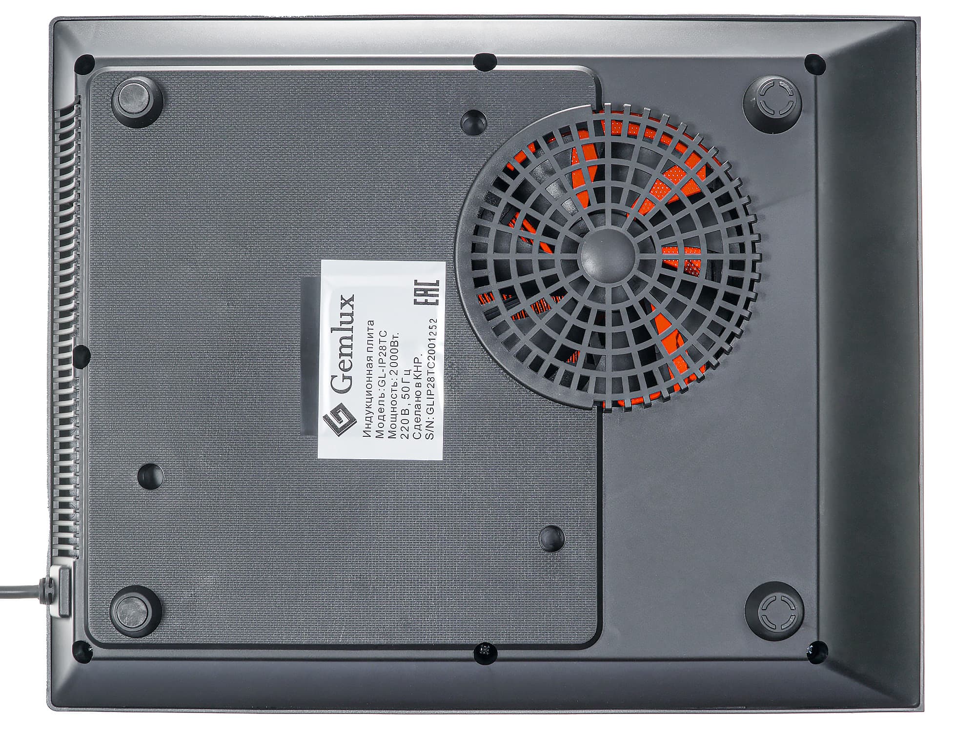 На дне также есть решетка, закрывающая лопасти собственно вентилятора и позволяющая подсмотреть изнутри на вид индукционной катушки. Еще там находятся четыре ножки, причем задние имеют прорезиненные вставки для большей устойчивости.