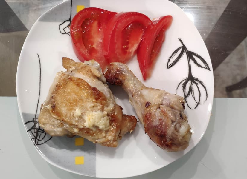 Поддавшись ностальгическому настроению, мы обнаружили желание вспомнить еще один простой и ассоциирующийся с советской кухней рецепт — жареная курица со сметаной и чесноком. Поскольку грудку мы уже сварили, оставшиеся части тушки были нарезаны и смазаны смесью сметаны вместе с давленым чесноком. Кусочки курицы мы выложили в сковороду с дном диаметром 18,5 см и включили сначала максимальную мощность, затем остановились на 800 Вт, которые по факту 1250 Вт.