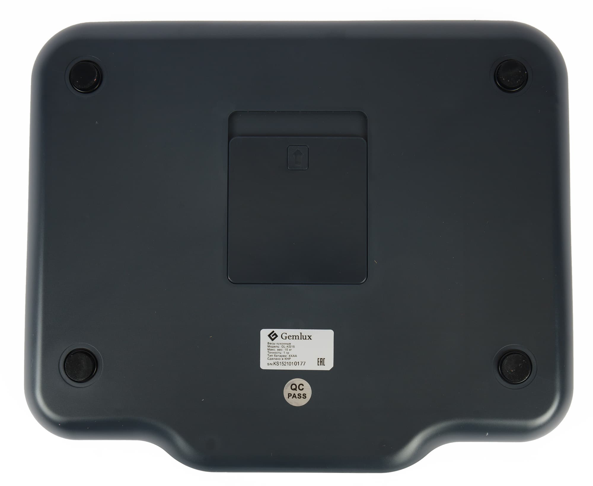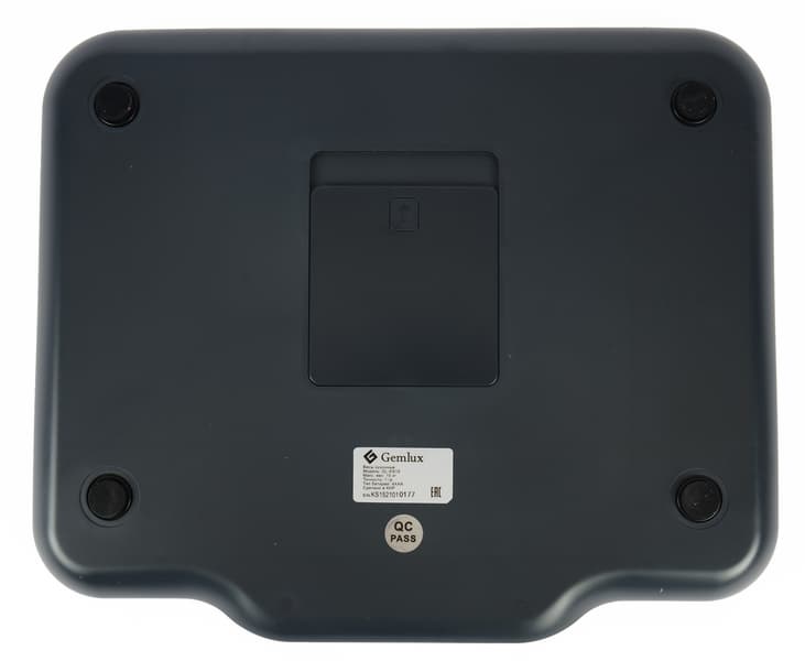 Со стороны дна расположены четыре невысокие ножки с резиновыми накладками, шильдик с краткой информацией о приборе и отсек для установки элементов питания. Благодаря накладкам весы устойчиво держатся даже на скользкой поверхности.