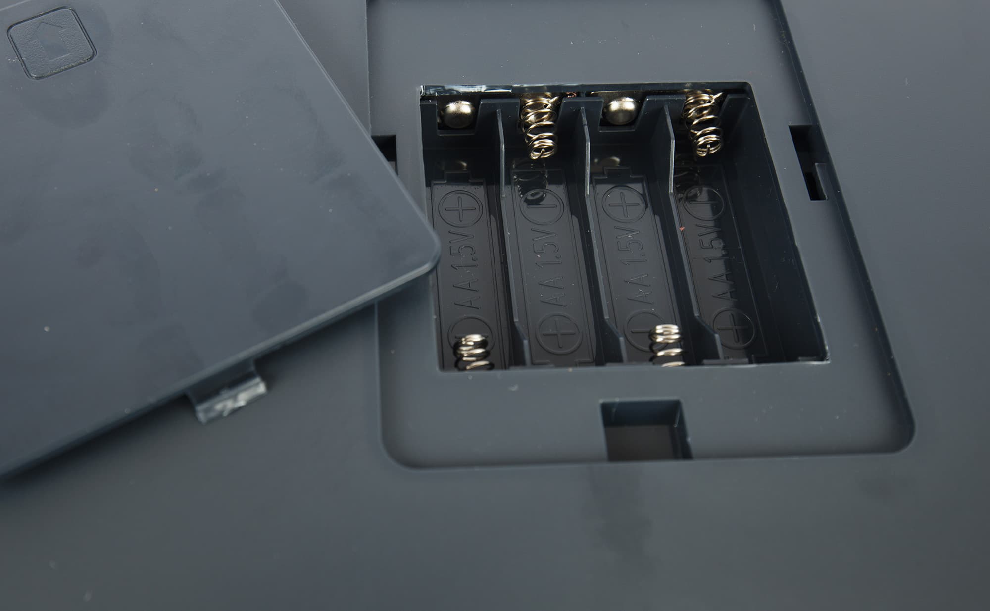 Отсек для питания спрятан под пластиковую крышку, которая открывается при сдвигании ее в сторону. Под крышкой — место для установки четырех стандартных пальчиковых батареек типа АА.
