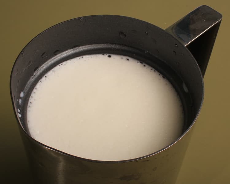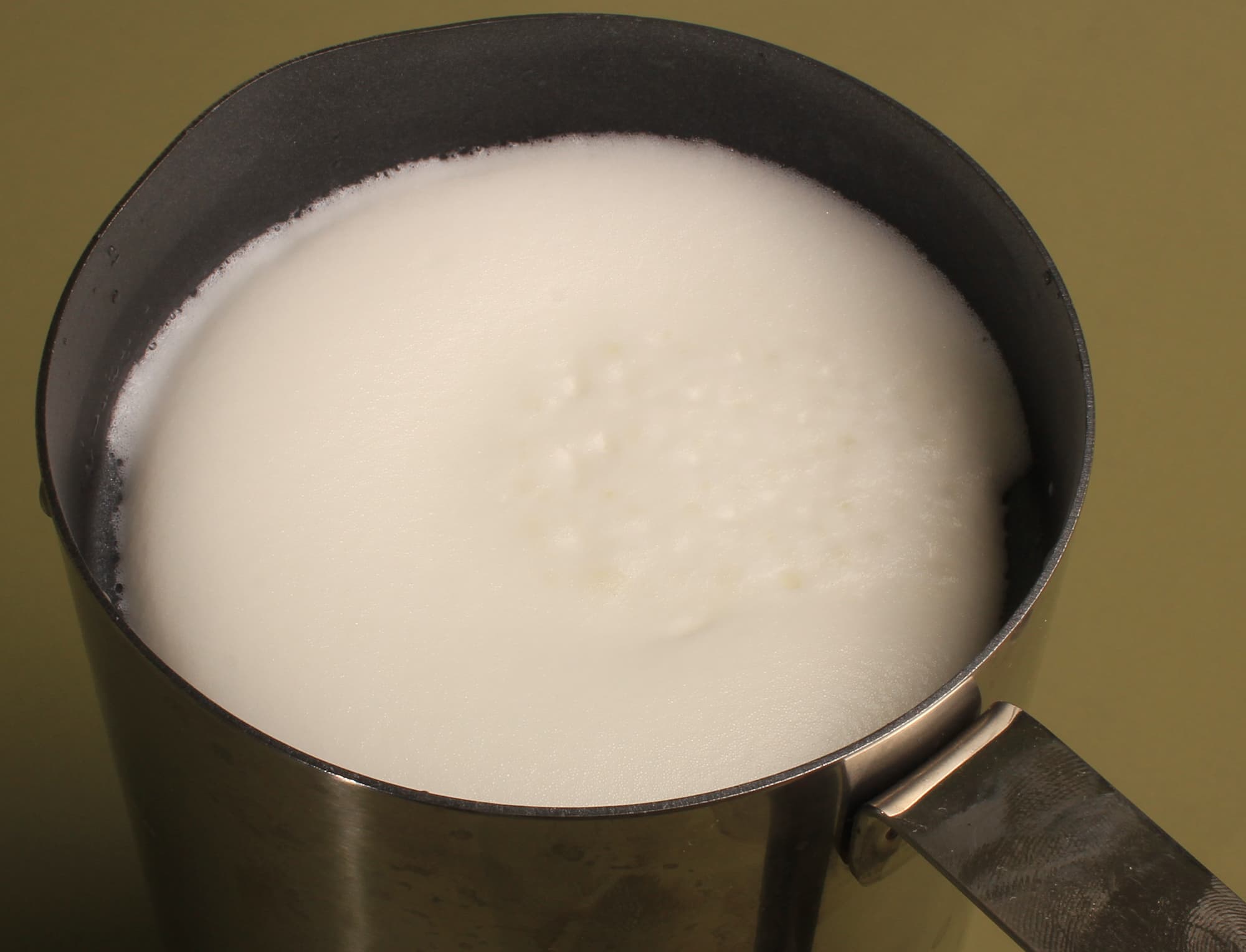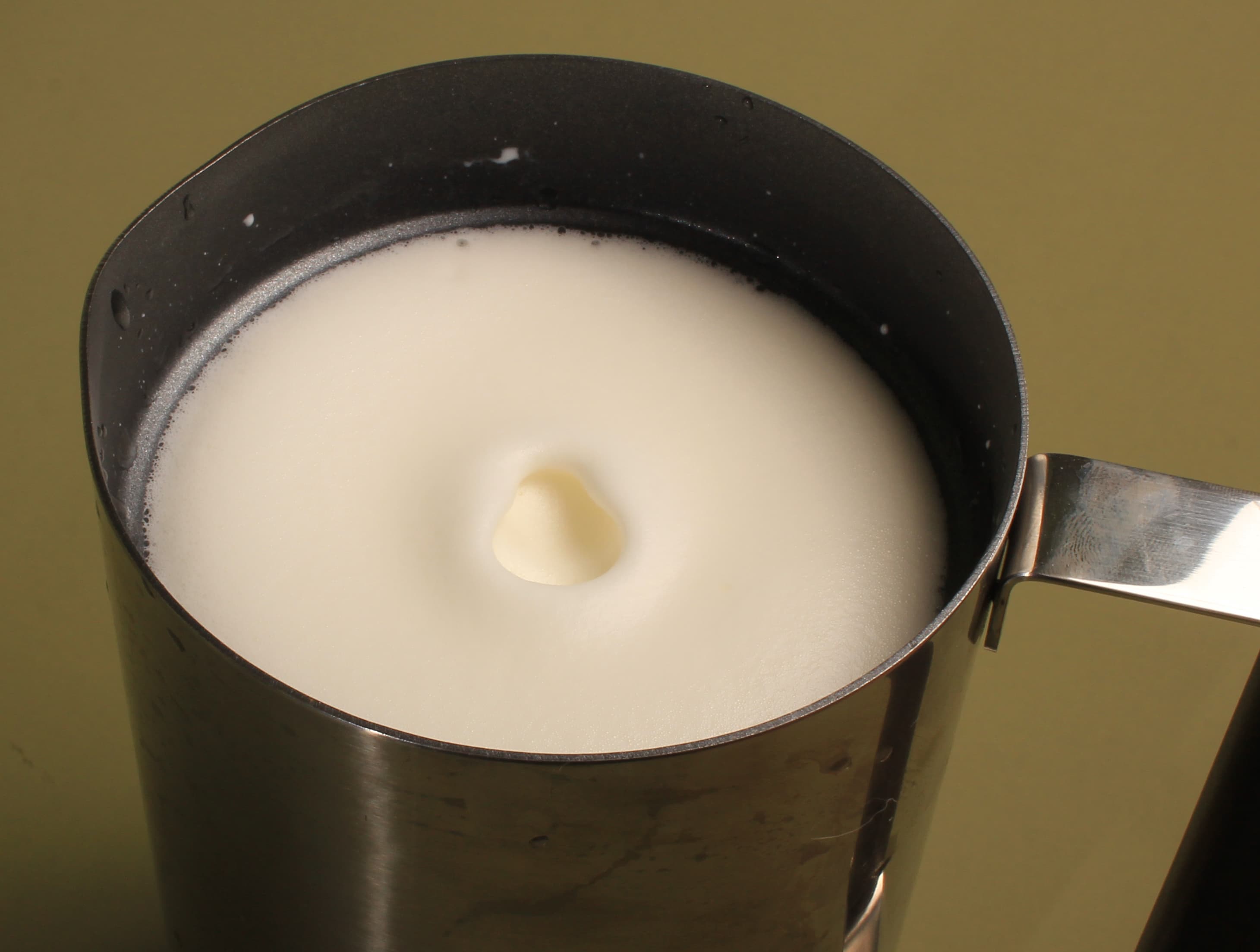 Молоко пониженной жирности мы взбили с подогревом и получили примерно такую же мелкопузырчатую пенку, как и с более жирным молоком. Однако она быстрее оседала, хотя ее все равно можно было использовать для капучино, а не только для латте.