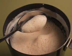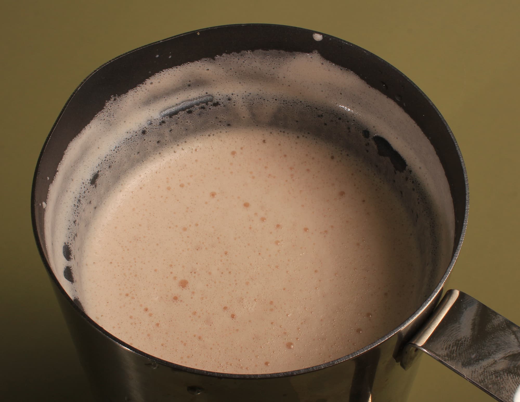 Мы смешали молоко с растворимым какао и попробовали взбить получившуюся смесь с подогревом. Получилась не пена, но вкусный слегка вспененный напиток. Понравится детям.