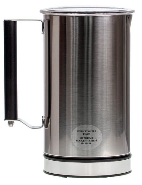 С одной из боковых сторон изображен тот же прибор, только не целиком, а частично. Тут же перечень его особенностей: двойные стенки, антипригарное покрытие, объем нагреваемого молока (от 75 до 250 мл), объем молока для нагревания и вспенивания (от 75 до 115 мл) и рабочая температура (65 градусов).