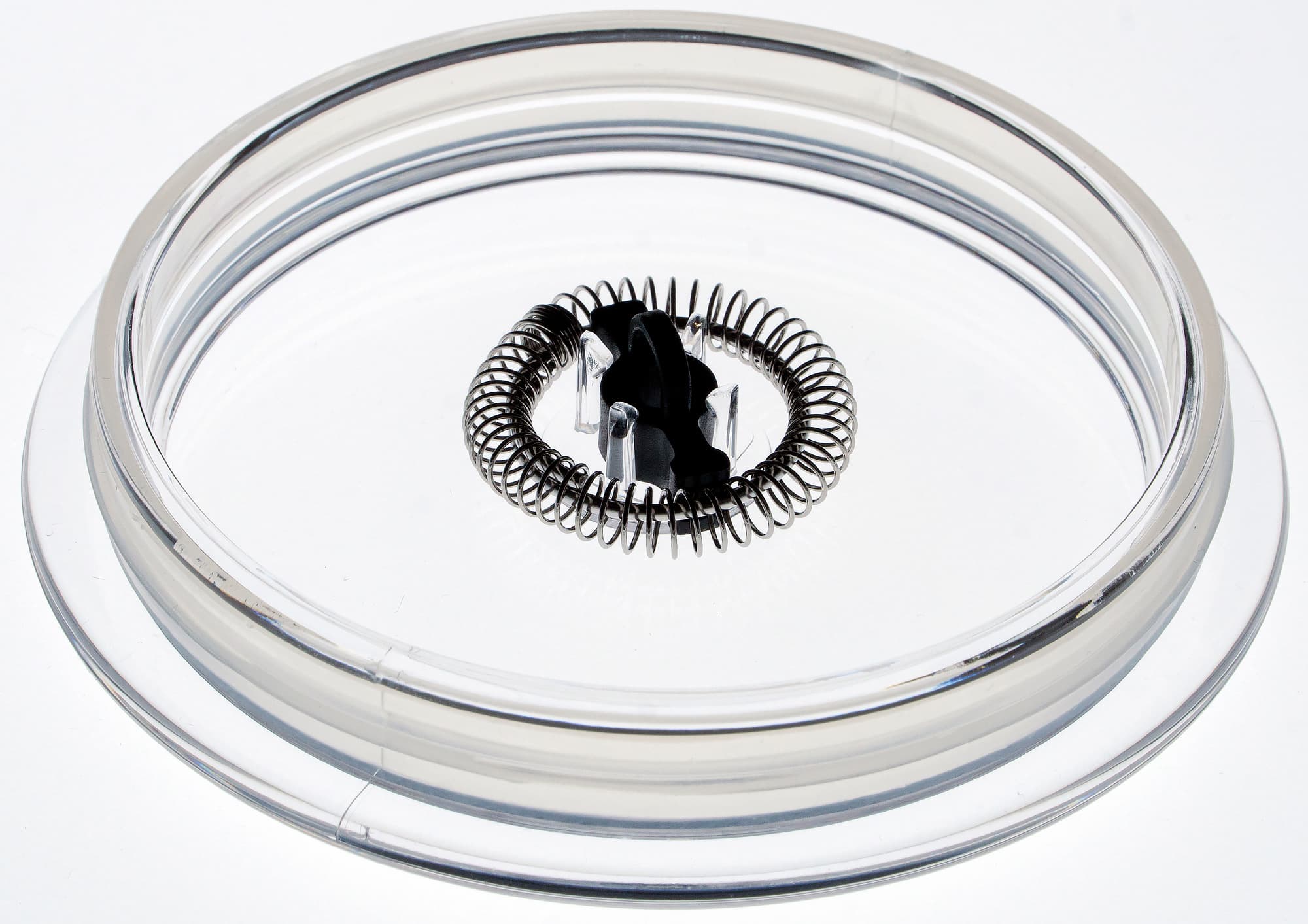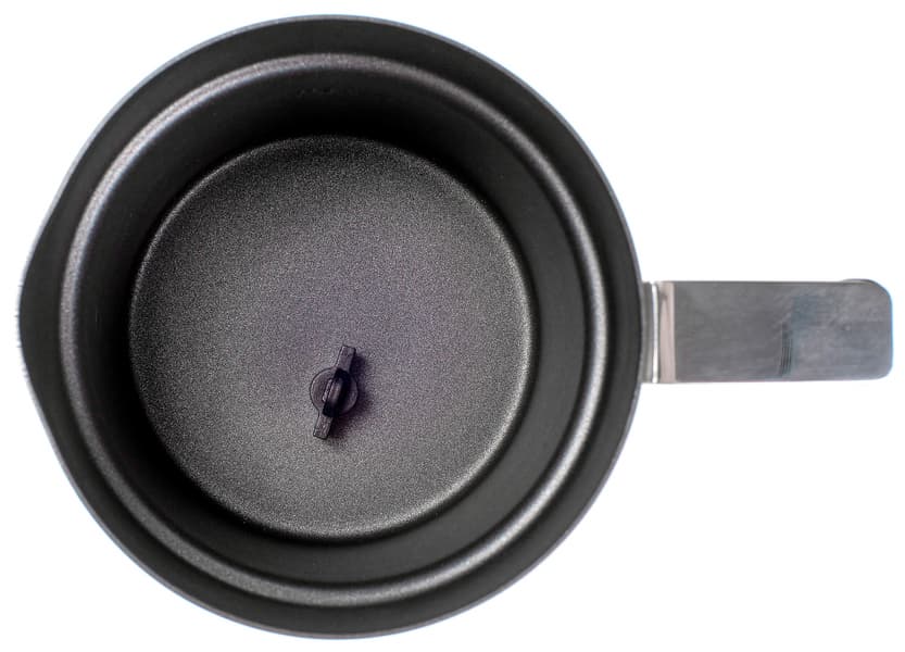 Больше половины объема подогревателя занимает закрытый отсек с мотором, поэтому на долю емкости для молока остается совсем немного. Внутренние стенки и дно этой емкости покрыты антипригарным покрытием, на который нанесены две метки максимального объема: для вспенивания пониже, для подогревания — повыше. На шпенек в дне — он находится не посередине, а ближе к одному из краев подогревателя — устанавливается одна из двух насадок: для вспенивания молока и для его подогревания. По умолчанию установлена насадка для подогрева, а вторая хранится в держателе на крышке.