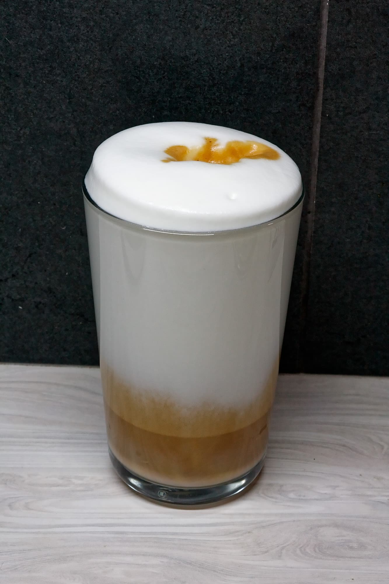 В результате получили вариацию латте макиато — горячего кофейного напитка, полученного путем вливания в молоко кофе-эспрессо в пропорции 3:1.
