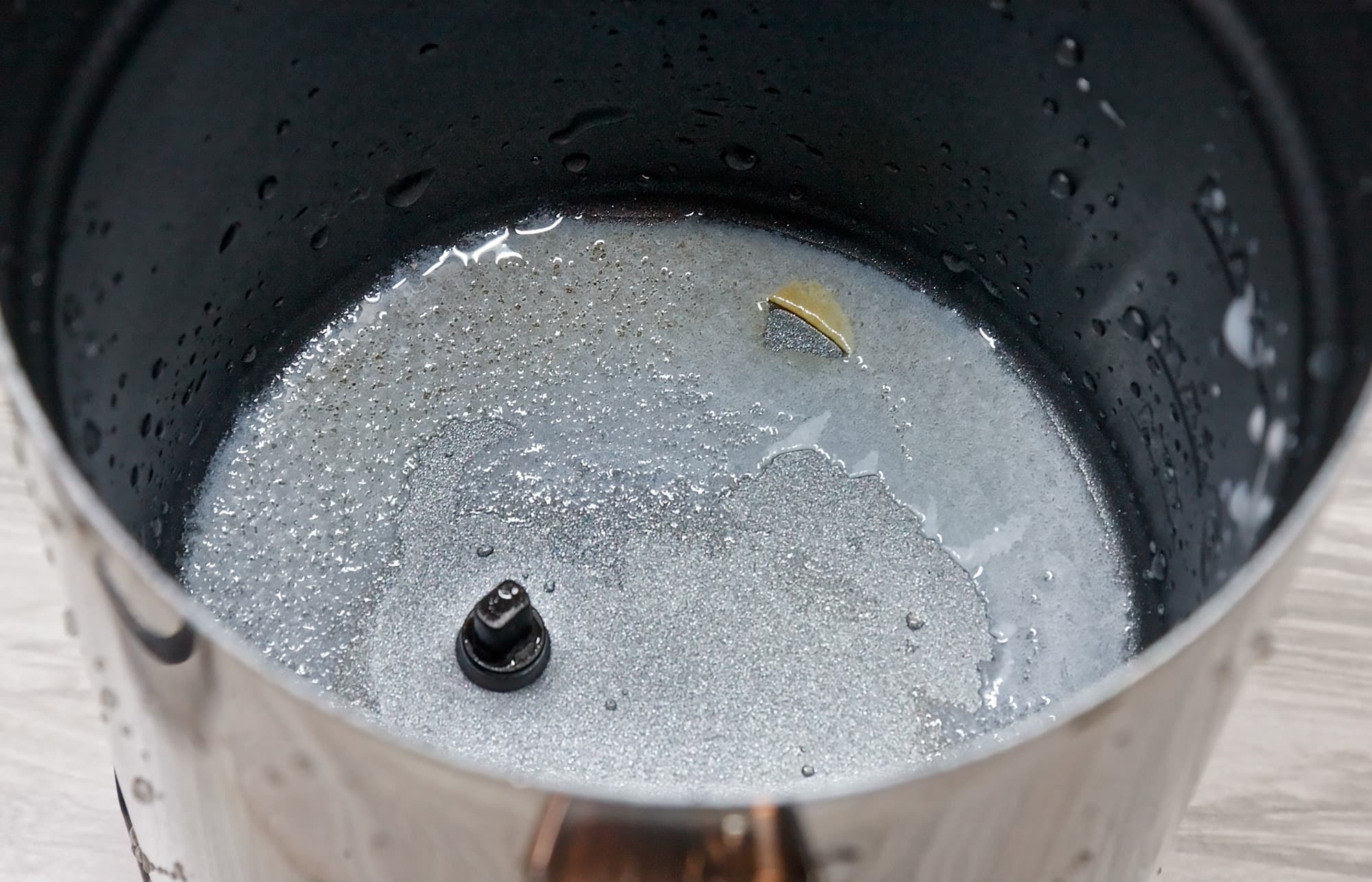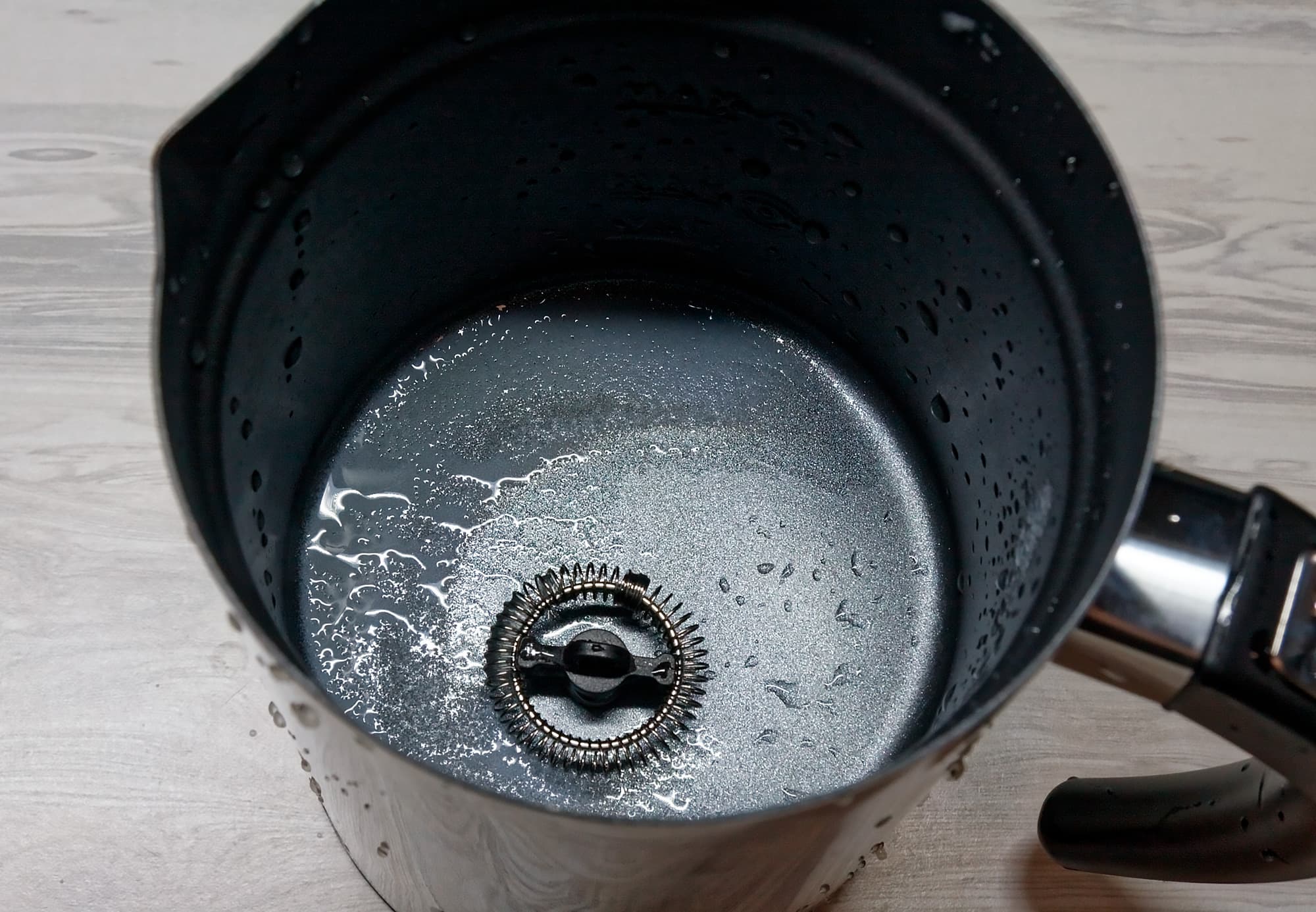 Специально для тех, кто задается вопросом «не будет ли молоко пригорать» мы сделали фото внутренней поверхности кувшина сразу после завершения работы. В режиме вспенивания с подогревом остатки пены мы смысли горячей водой, после чего наблюдали лишь небольшую пленку на дне, которая с легкостью счищается с помощью обычной губки для мытья посуды.
